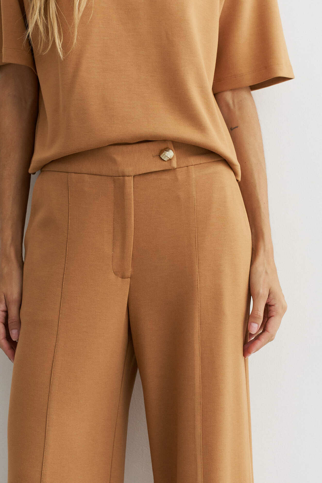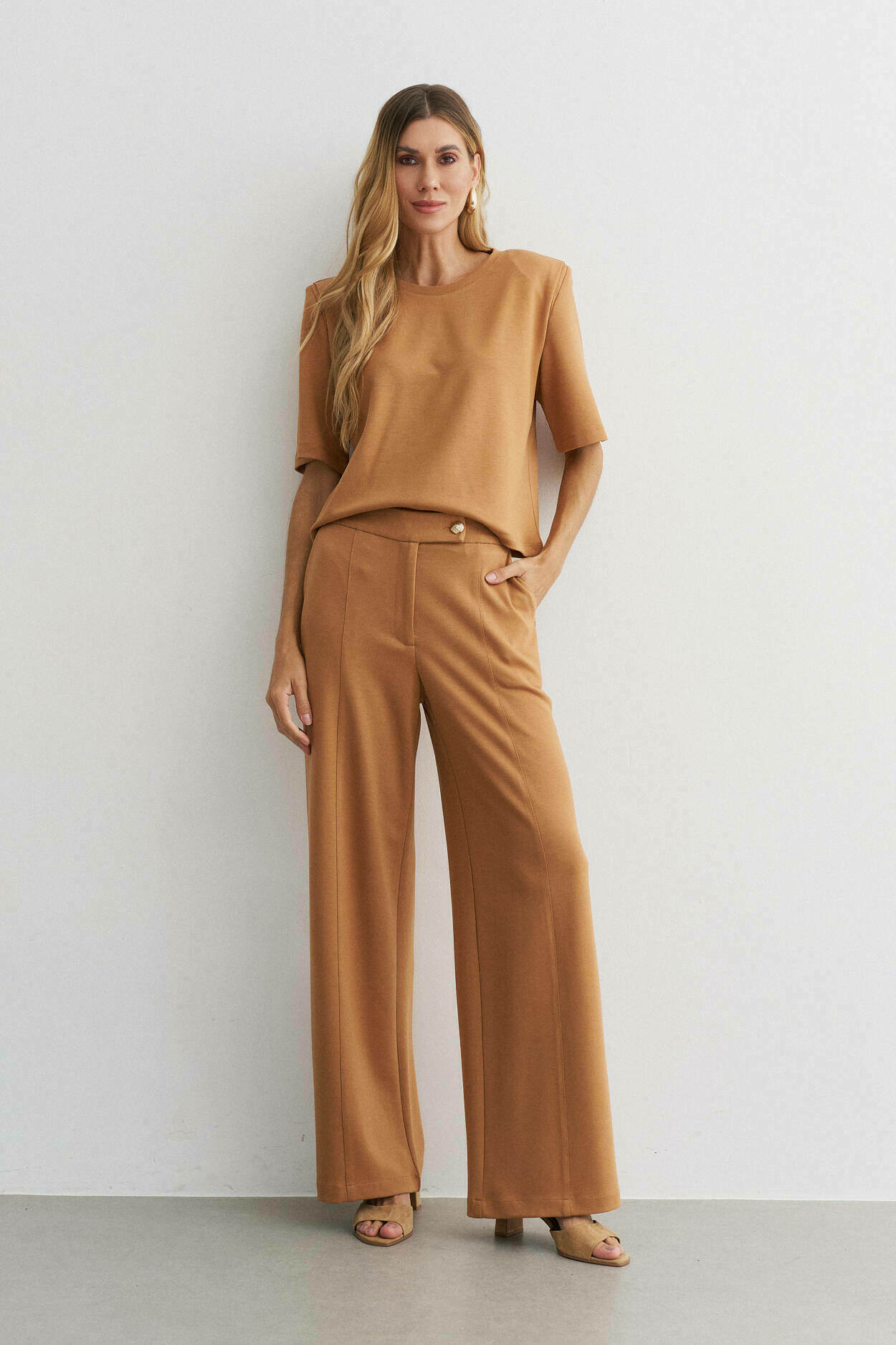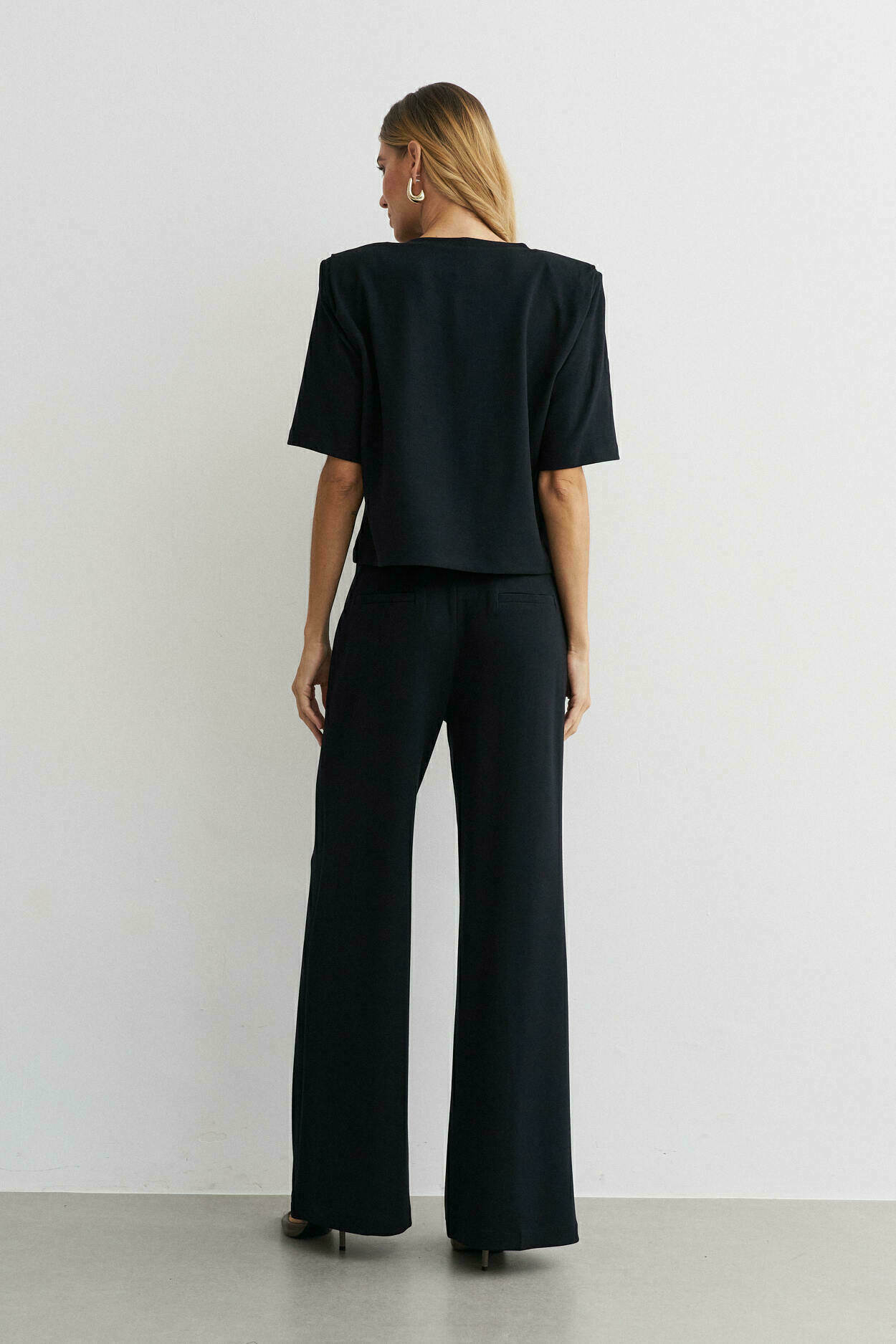 Conjunto moletom. Blusa com pregas e ombreira. Calça pantalona, bolso nas laterais, e fechamento por botão lateral.