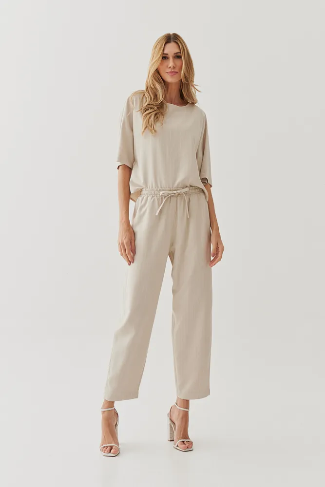 Ficha técnica: Conjunto confeccionado em tecido de alfaiataria com risca de giz. Blusa de modelagem morcego com mangas amplas e decote redondo. Calça com elástico na cintura, amarração frontal e bolsos laterais. Cor: mostarda clara. Origem: nacional. Cuidados: lavar à mão, não alvejar, secar à sombra e passar em temperatura média.