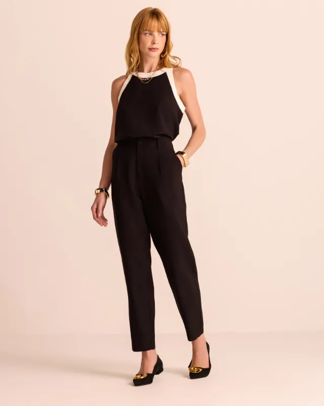Ficha técnica: conjunto confeccionado em marant 90% viscose e 10% poliéster, sem forro, blusa halter neck, calça cenoura com prega frontal, recorte bicolor, caimento leve e elegante, cores preto e off-white, origem nacional. Cuidados de lavagem: lavar à mão ou em ciclo delicado, não usar alvejante, secar à sombra e passar em temperatura baixa.