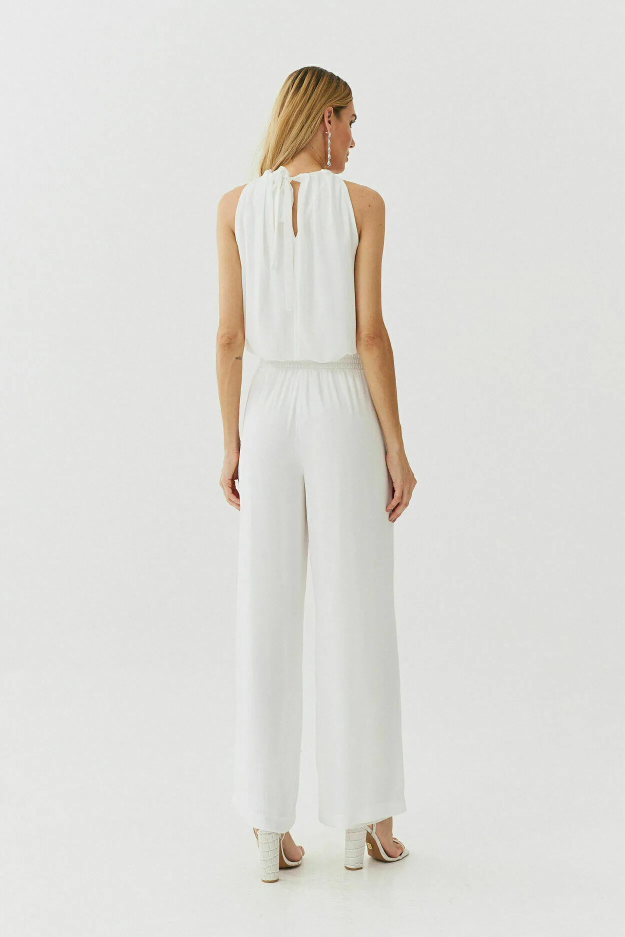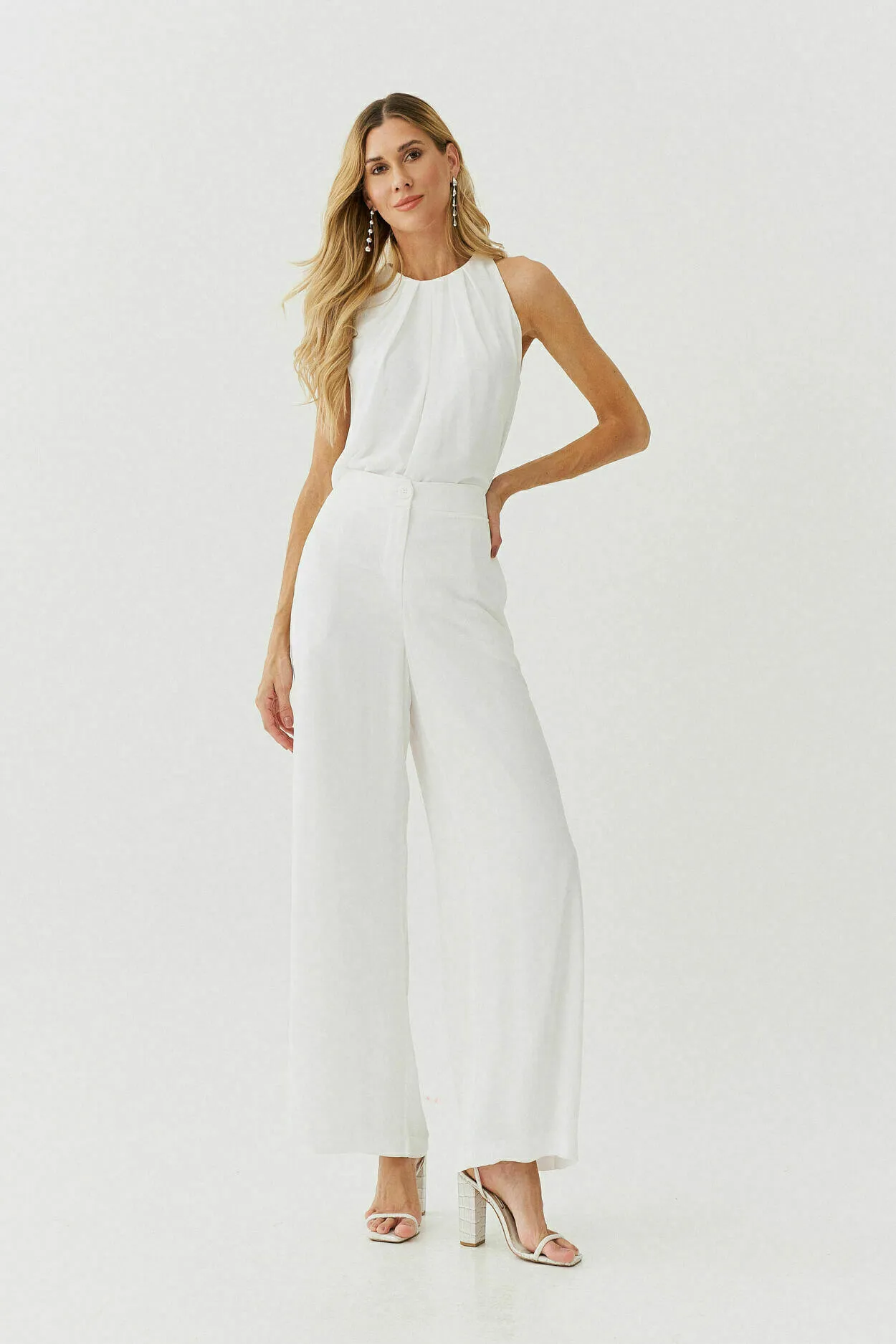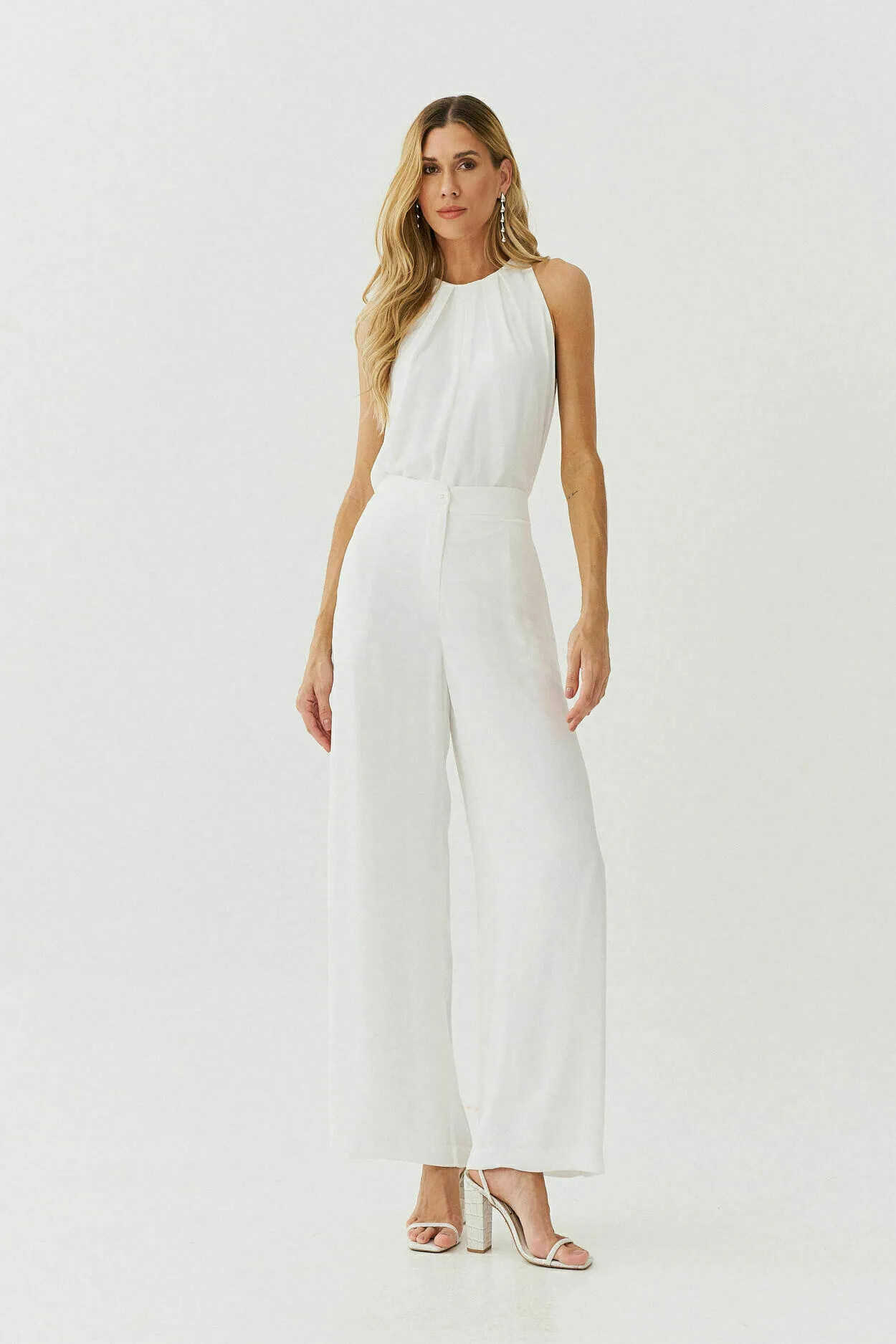 Composição: 100% poliéster. Modelagem: blusa com pregas no decote e fechamento por amarração nas costas; calça pantalona com bolsos laterais. Cor: off-white. Origem: nacional 🇧🇷. Cuidados: lavar à mão com sabão neutro, secar à sombra e passar em temperatura baixa do avesso.