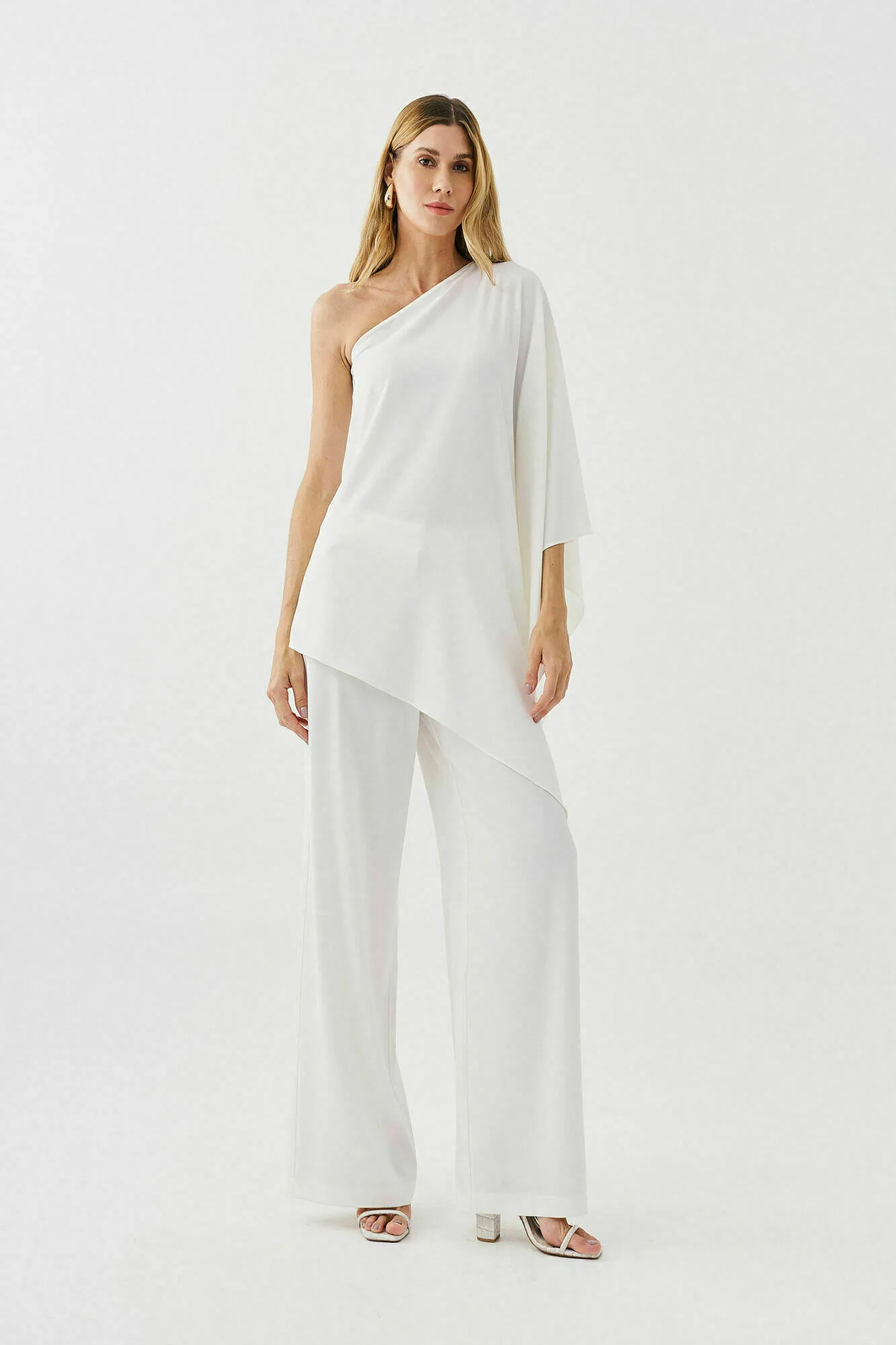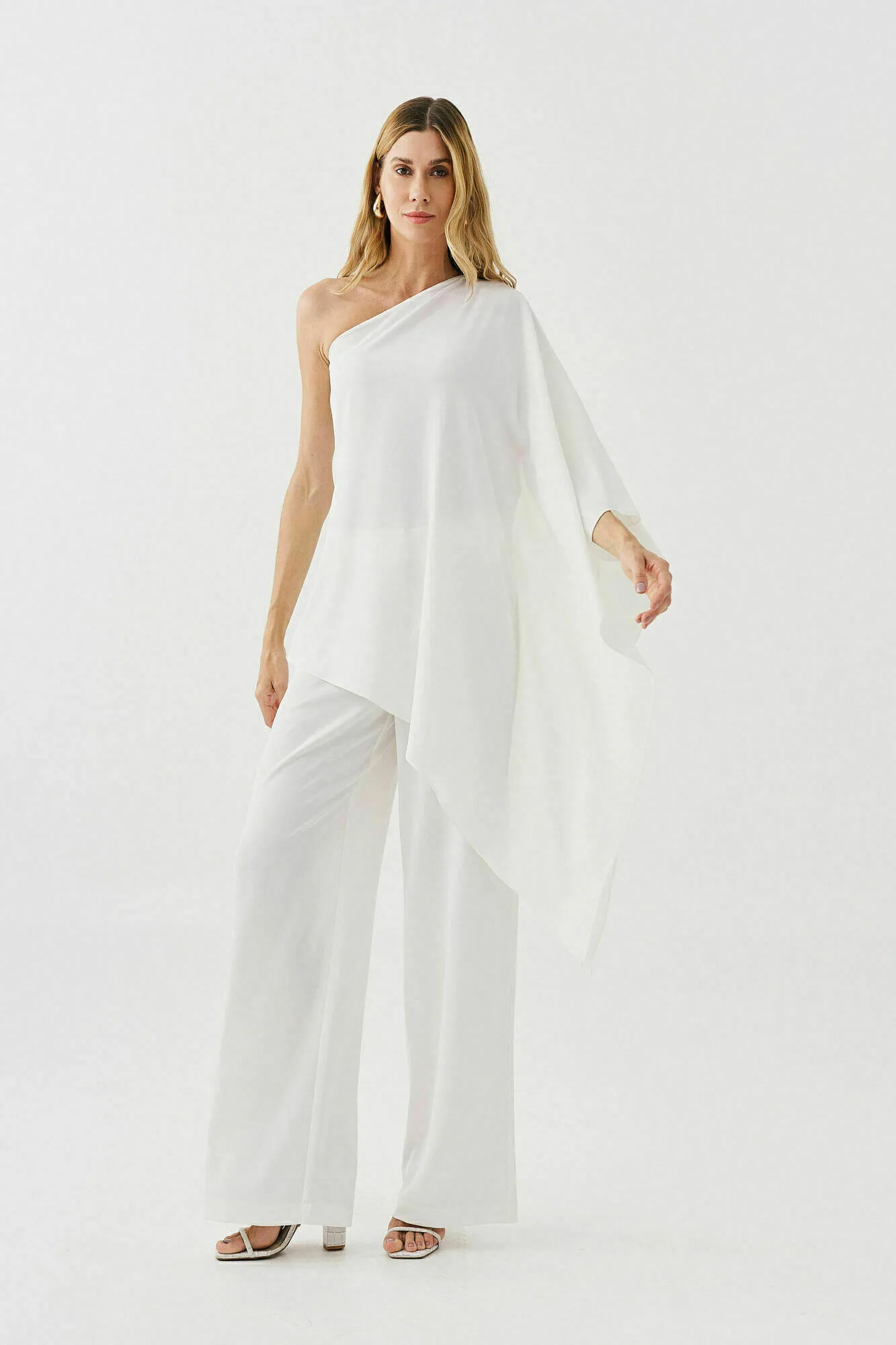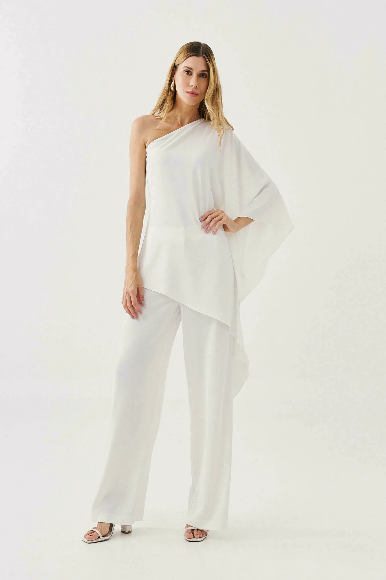 Ficha técnica: confeccionado em tecido crepe de toque macio e caimento fluido, conjunto composto por blusa estilo capa com design assimétrico e calça pantalona de modelagem ampla, não possui forro, acabamento refinado que garante elegância e conforto, cor off-white, peça de origem nacional, recomenda-se lavar à mão ou em ciclo delicado, não usar alvejante, não torcer e secar à sombra para preservar a durabilidade do conjunto feminino sofisticado.