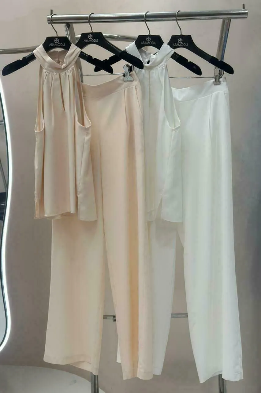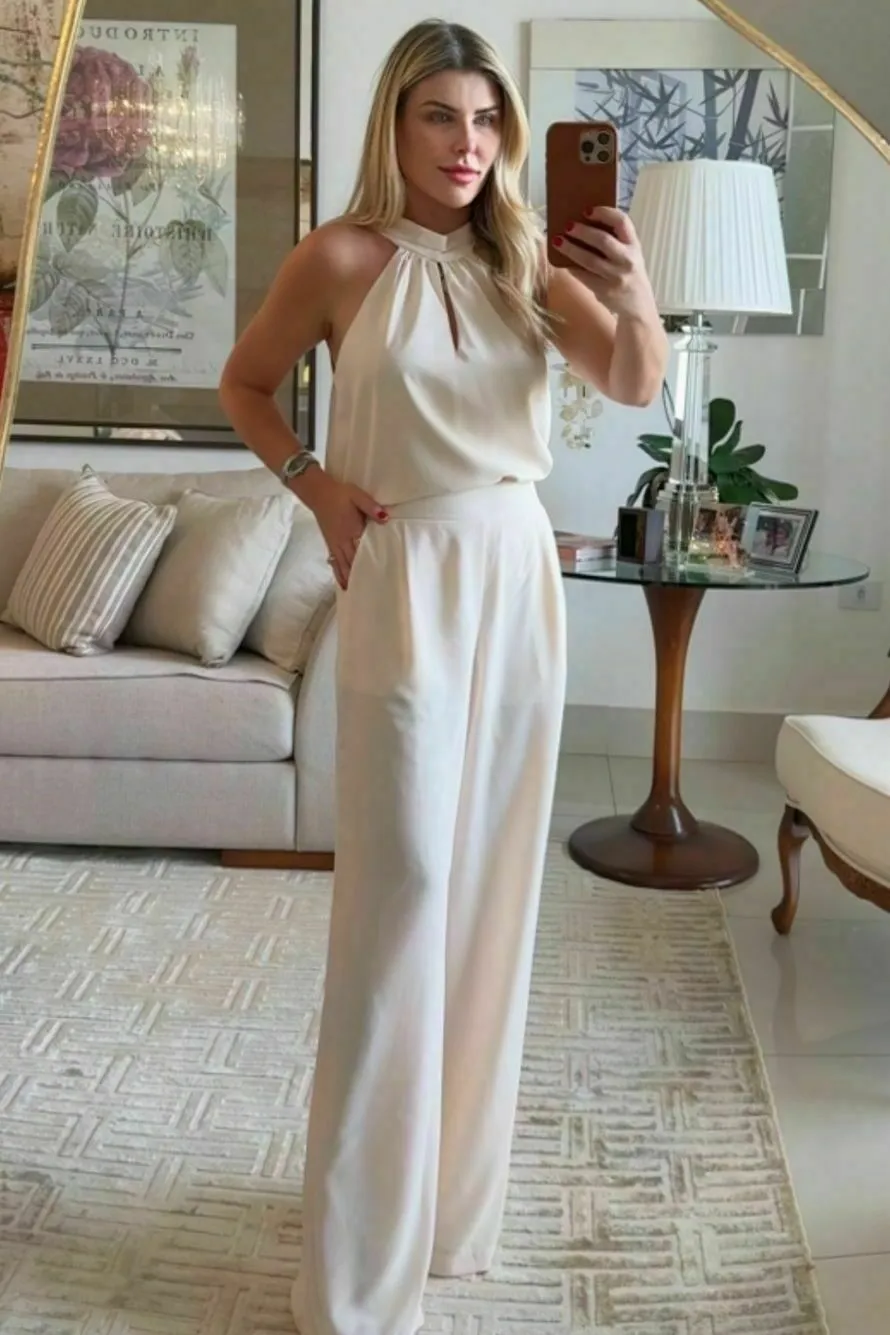 Ficha técnica: conjunto confeccionado em crepe, composição não informada, blusa com decote halter neck, calça pantalona de cintura média, caimento fluido e elegante, cor off-white, origem nacional. Cuidados de lavagem: lavar à mão ou em ciclo delicado, não usar alvejante, secar à sombra e passar em temperatura baixa, preferencialmente a vapor.