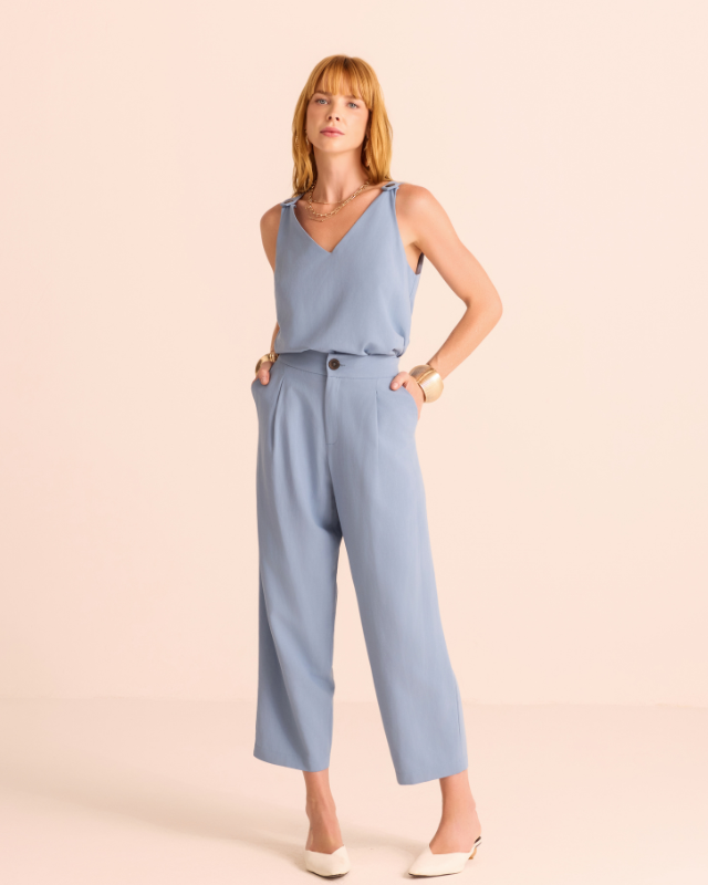 Ficha técnica: conjunto confeccionado em viscolinho com 80% viscose e 20% linho, sem forro, regata com alças de martingale e decote em V, calça cenoura com prega frontal, fechamento com botão tartarugado, caimento leve e estruturado, cor azul claro, origem nacional. Cuidados de lavagem: lavar à mão ou em ciclo delicado, não usar alvejante, secar à sombra e passar em temperatura baixa.