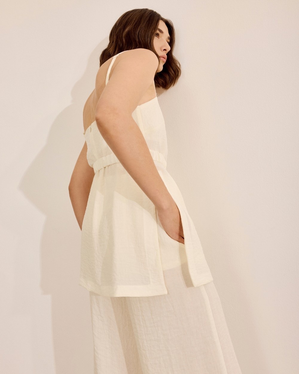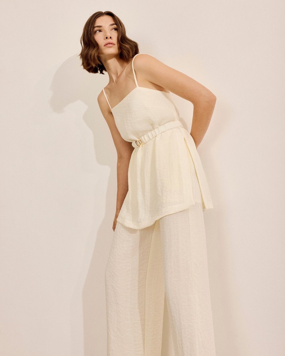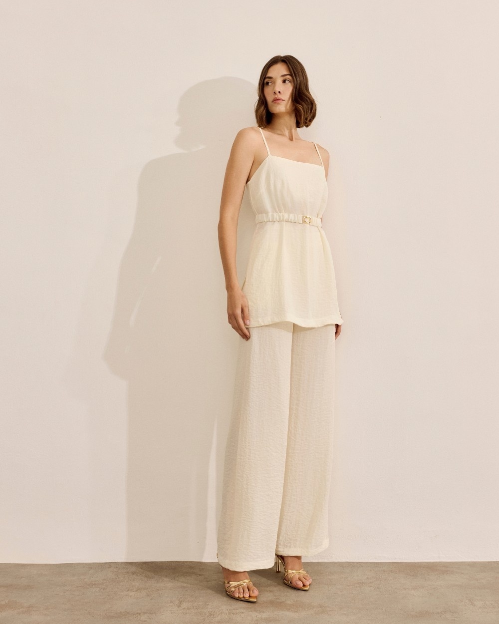 Conjunto confeccionado em viscose com poliamida, composto por blusa alongada de alças finas e decote reto, com fendas laterais que garantem leveza ao visual. Acompanha cinto de elástico com fivela de encaixe, que valoriza a cintura com praticidade. A calça possui modelagem reta, cintura alta, zíper lateral e forro curto. 74% viscose 26% poliam