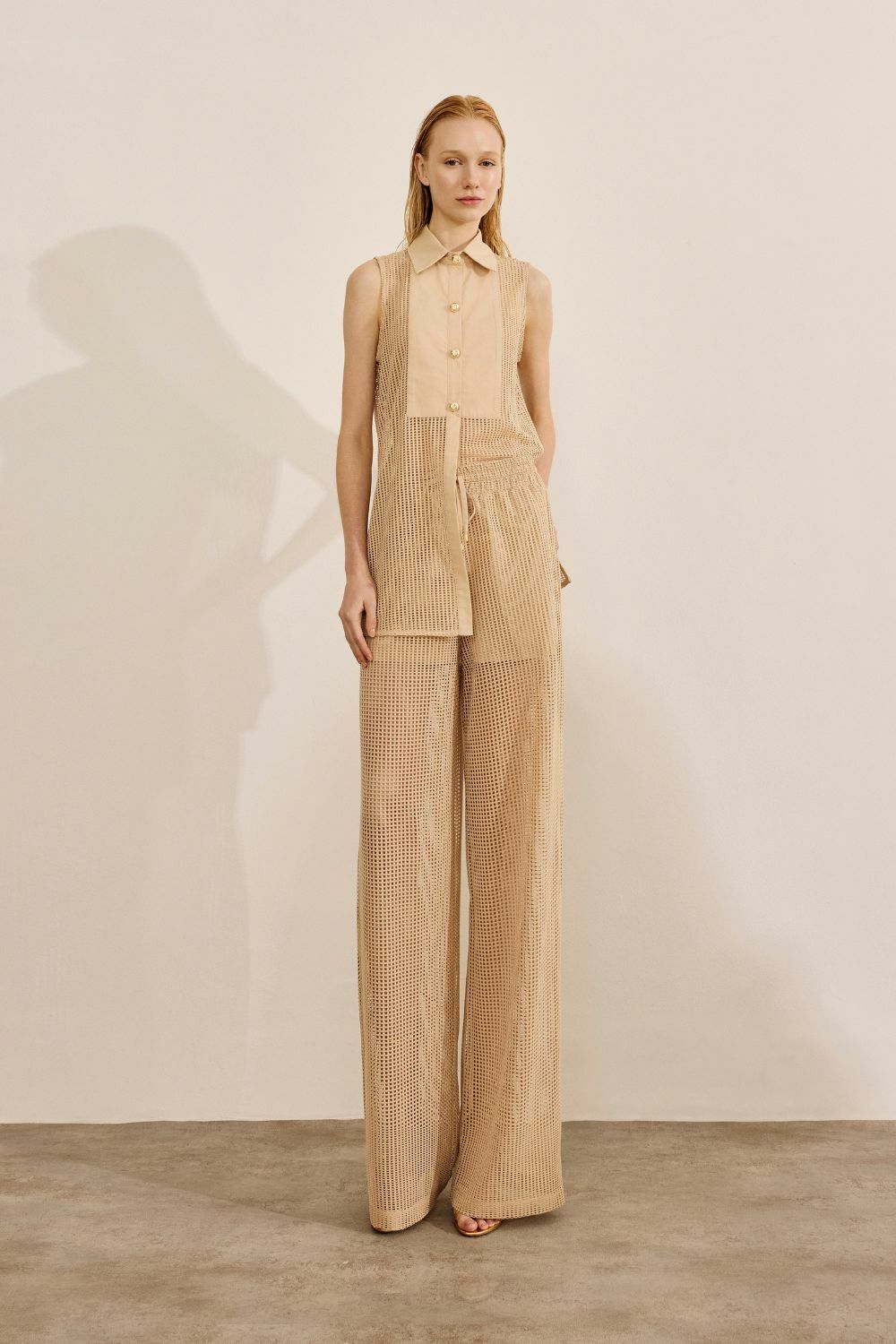 Ficha técnica: conjunto confeccionado em tecido de tela, composto por blusa sem mangas estilo camisa com fechamento frontal por botões metálicos, e calça pantalona com cós com elástico, amarração frontal com ponteiras metálicas, bolso aplicado nas costas e forro curto para maior conforto, cor intensa e sofisticada, composição do tecido conforme especificação do fabricante, peça de origem nacional, com cuidados de lavagem à mão ou em ciclo delicado, secagem à sombra e passagem em temperatura baixa para preservar a estrutura e a transparência do tecido.