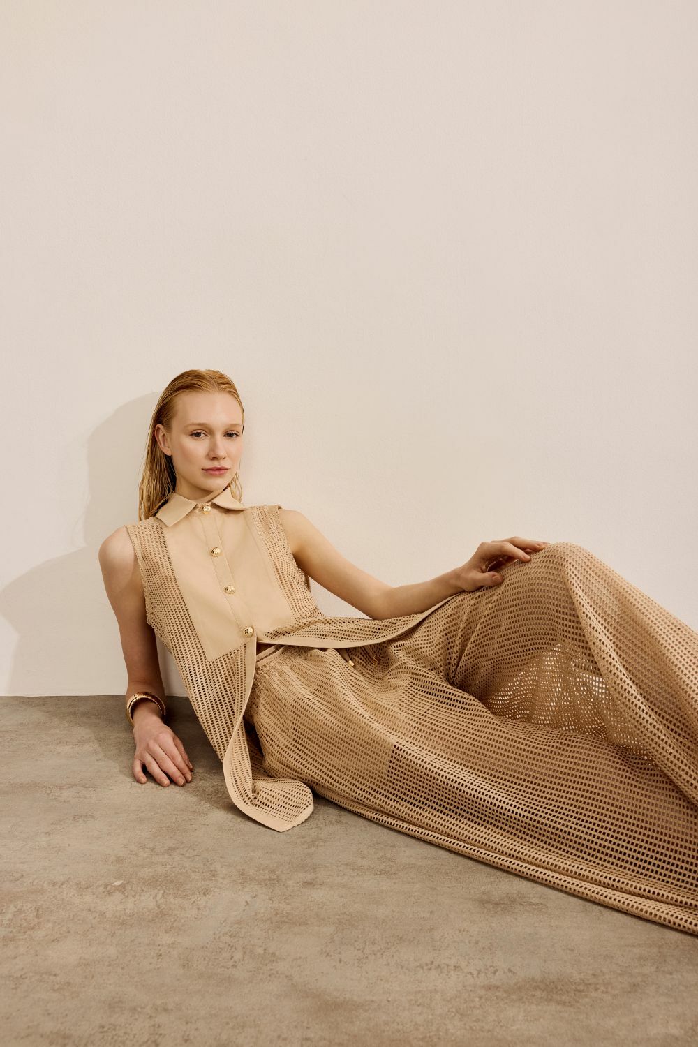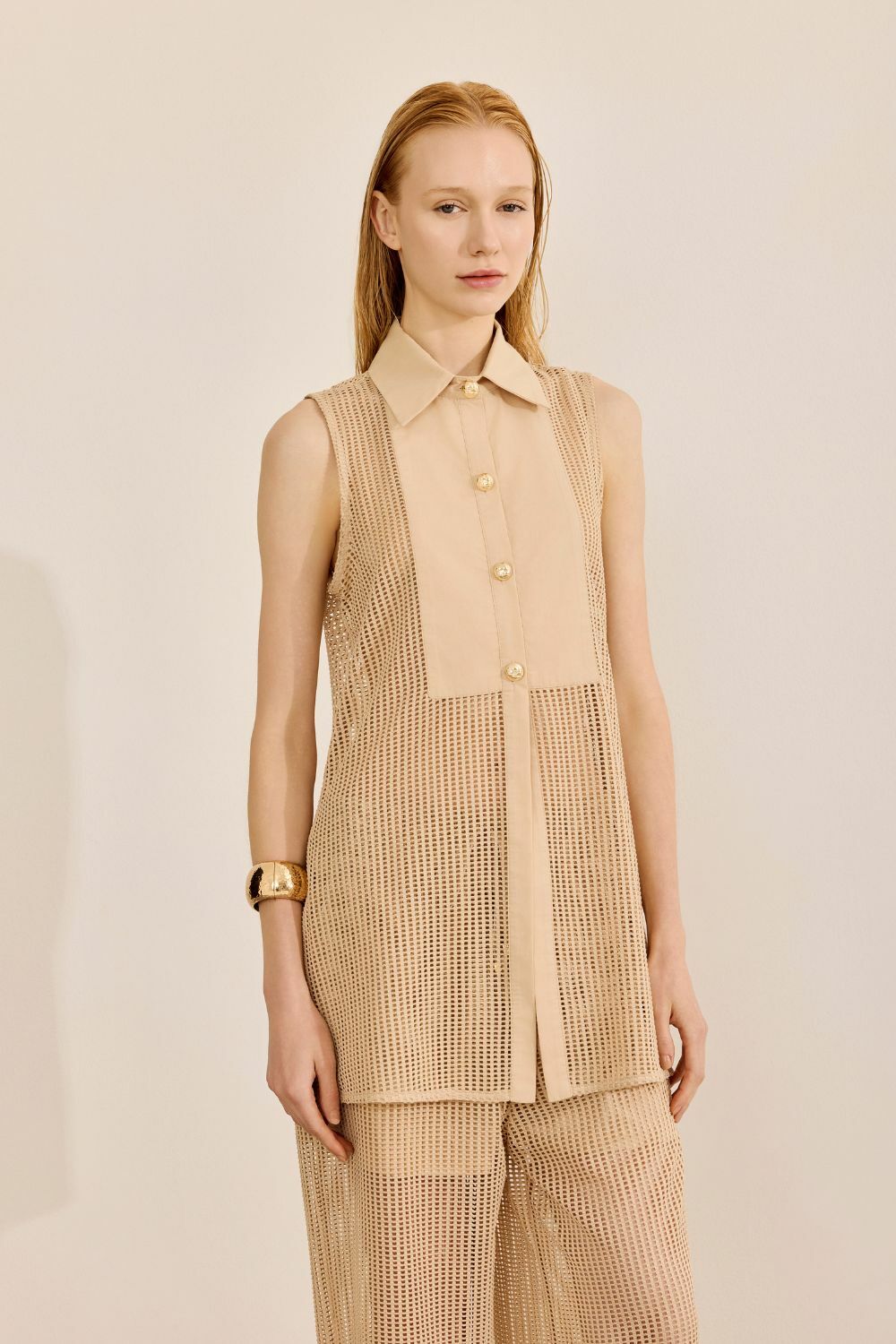 Leve, moderno e cheio de personalidade ✨, este conjunto em tela é a tradução perfeita de elegância descontraída com sofisticação atual. A transparência sutil do tecido cria um visual fresco e contemporâneo, ideal para mulheres que gostam de peças diferenciadas, mas fáceis de usar 🤍. A calça pantalona traz um caimento fluido e elegante, alongando a silhueta com naturalidade, enquanto o cós com elástico garante conforto absoluto no vestir. A amarração frontal com ponteiras metálicas adiciona um toque de acabamento refinado, e o bolso aplicado nas costas equilibra funcionalidade e estilo. Para garantir segurança e bem-estar, a peça conta com forro curto, que permite leveza sem abrir mão do conforto. A blusa estilo camisa sem mangas complementa o conjunto com um visual clean e atual, e o fechamento frontal por botões metálicos imprime um ar contemporâneo e sofisticado, perfeito para composições elegantes em dias mais quentes.