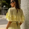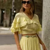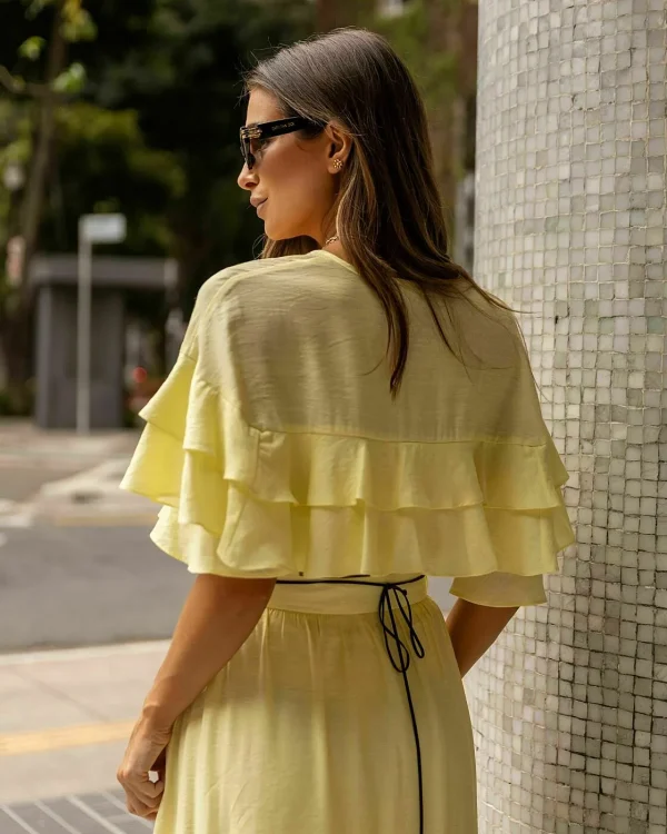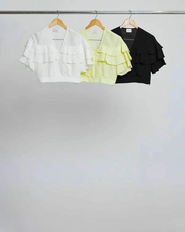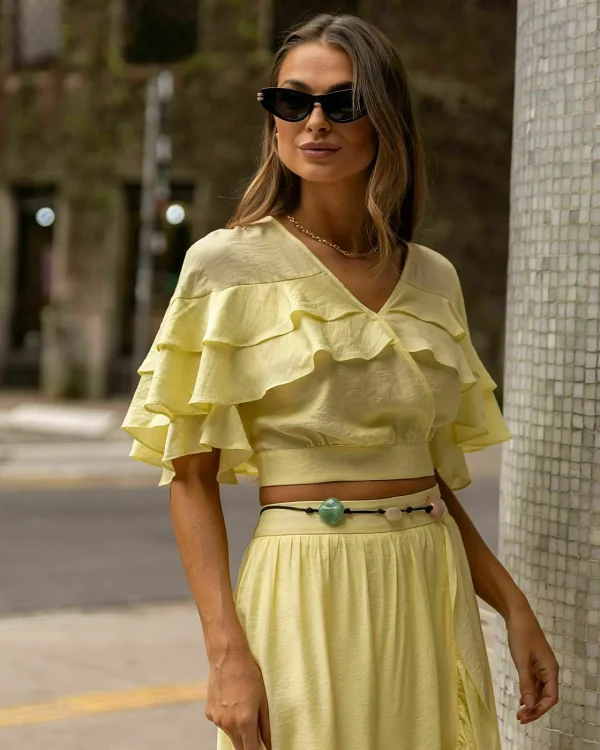 Cropped em viscose texturizada. Decote transpassado. Manga curta com babados em camadas.