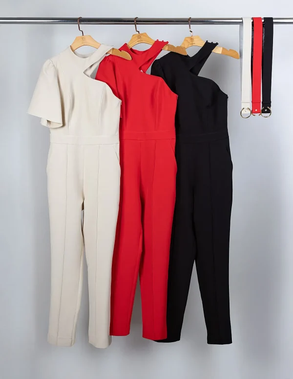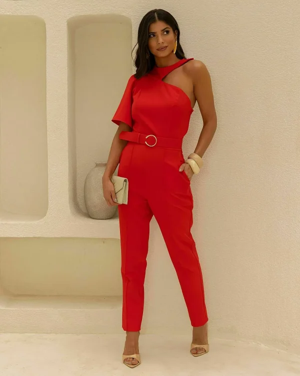 Esse macacão é puro impacto. Em alfaiataria, ele une modernidade e elegância com o decote assimétrico de um ombro só e a manga curta que cria contraste cheio de estilo. O cinto forrado valoriza a cintura, enquanto a gola com botões adiciona um detalhe sofisticado que foge do óbvio. Uma peça poderosa, perfeita para ocasiões em que você quer presença e confiança.