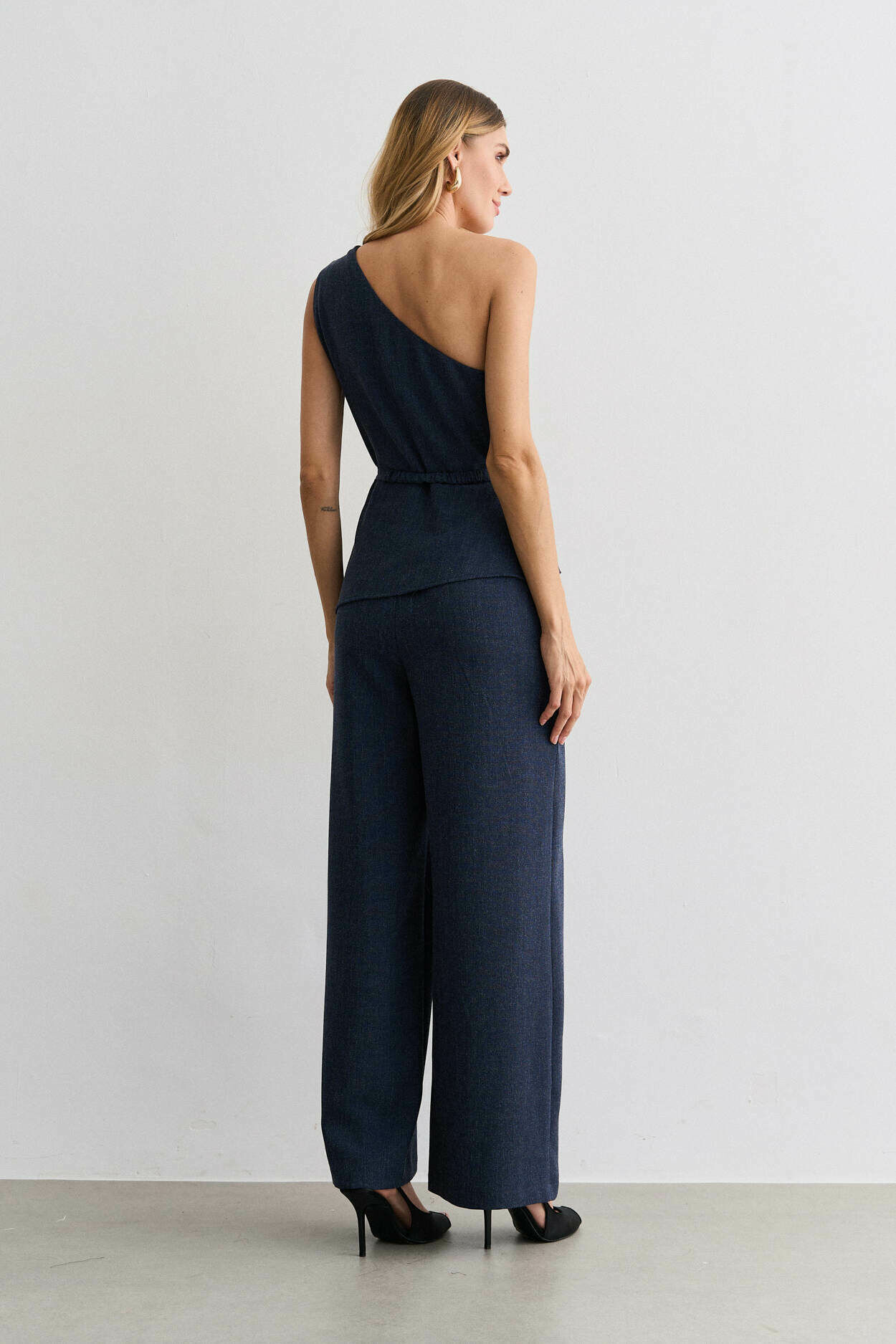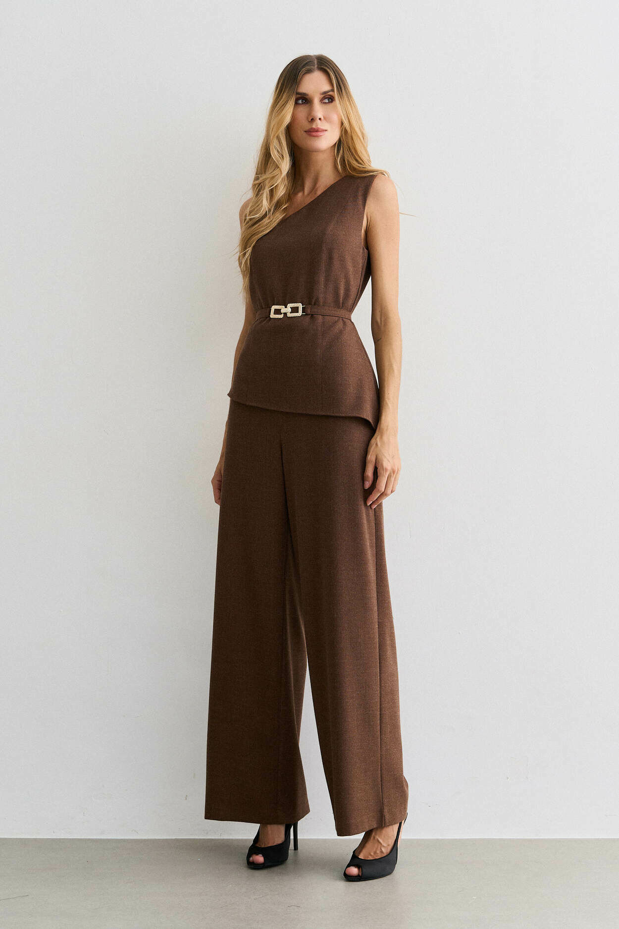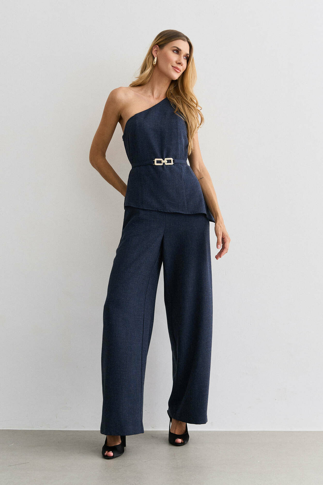 Macacão alfaiataria lã, um ombro, cinto metal, sobreposicao.
