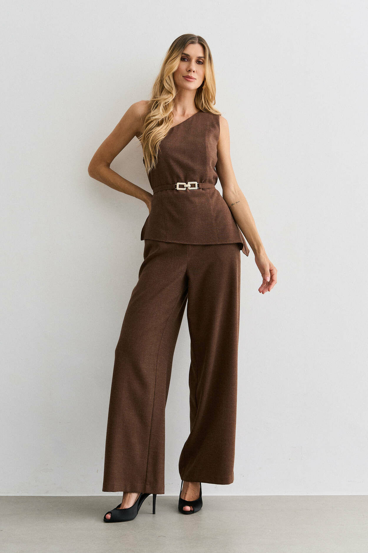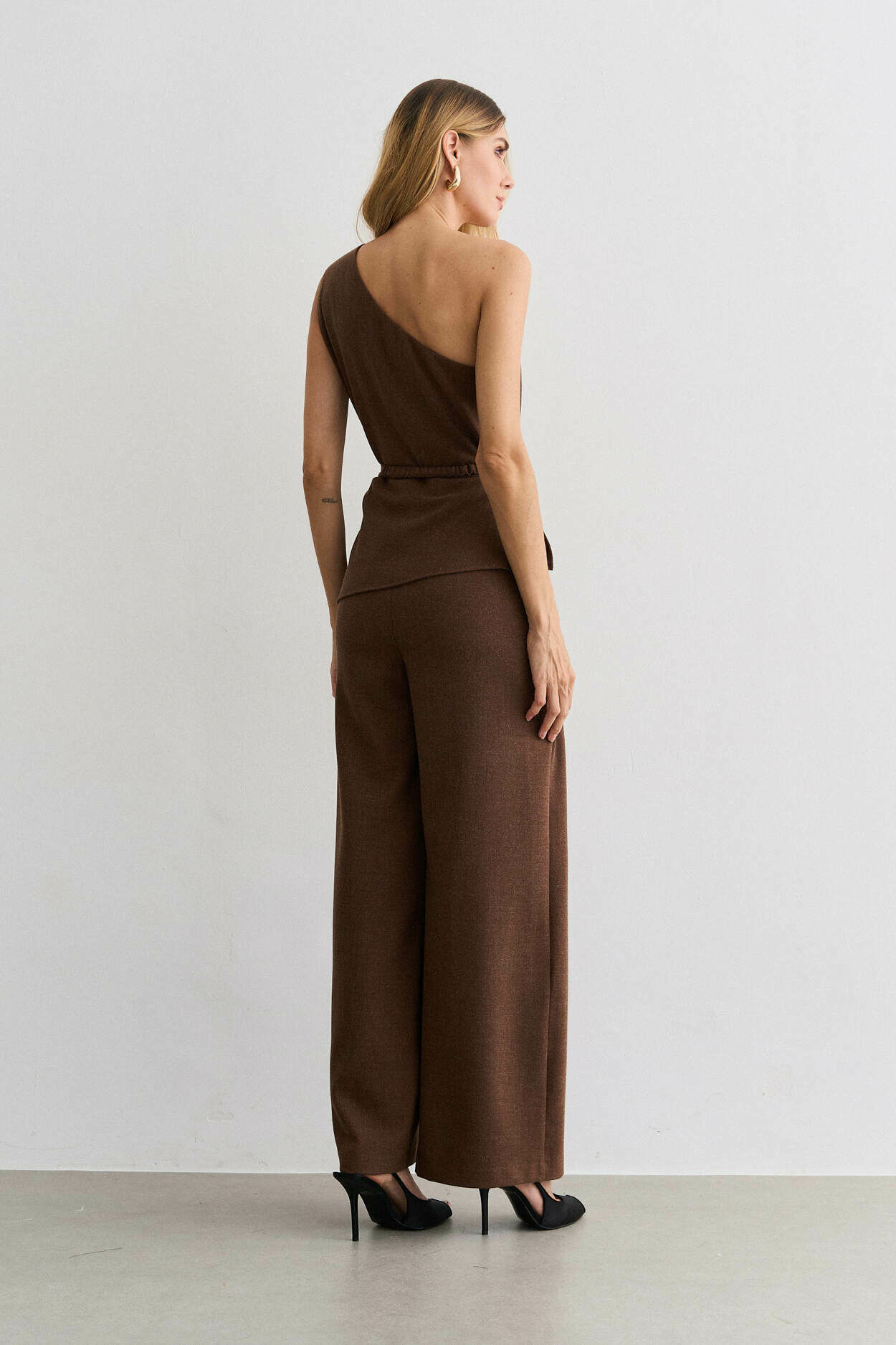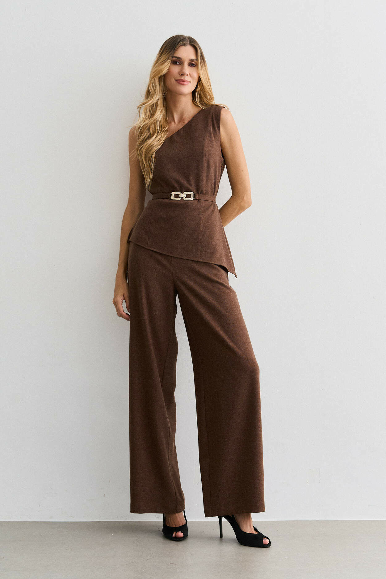 Macacão alfaiataria lã, um ombro, cinto metal, sobreposicao.