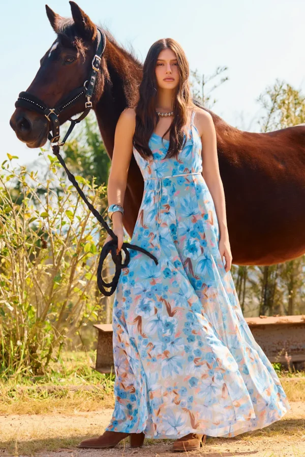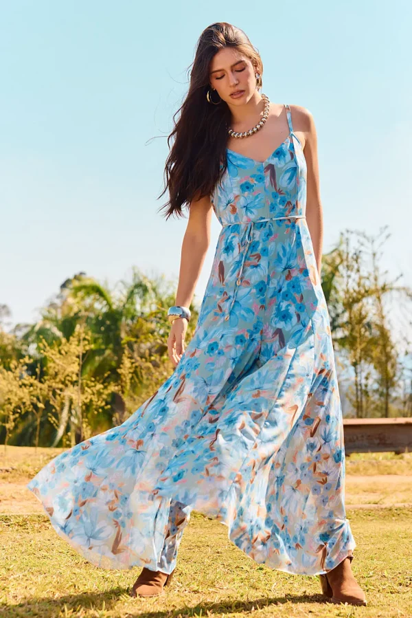 Macacão longo confeccionado em tule estampado floral, com forro interno que garante conforto e segurança no uso. Os recortes verticais com nesgas nas pernas criam um efeito de movimento fluido e elegante, proporcionando leveza a cada passo.