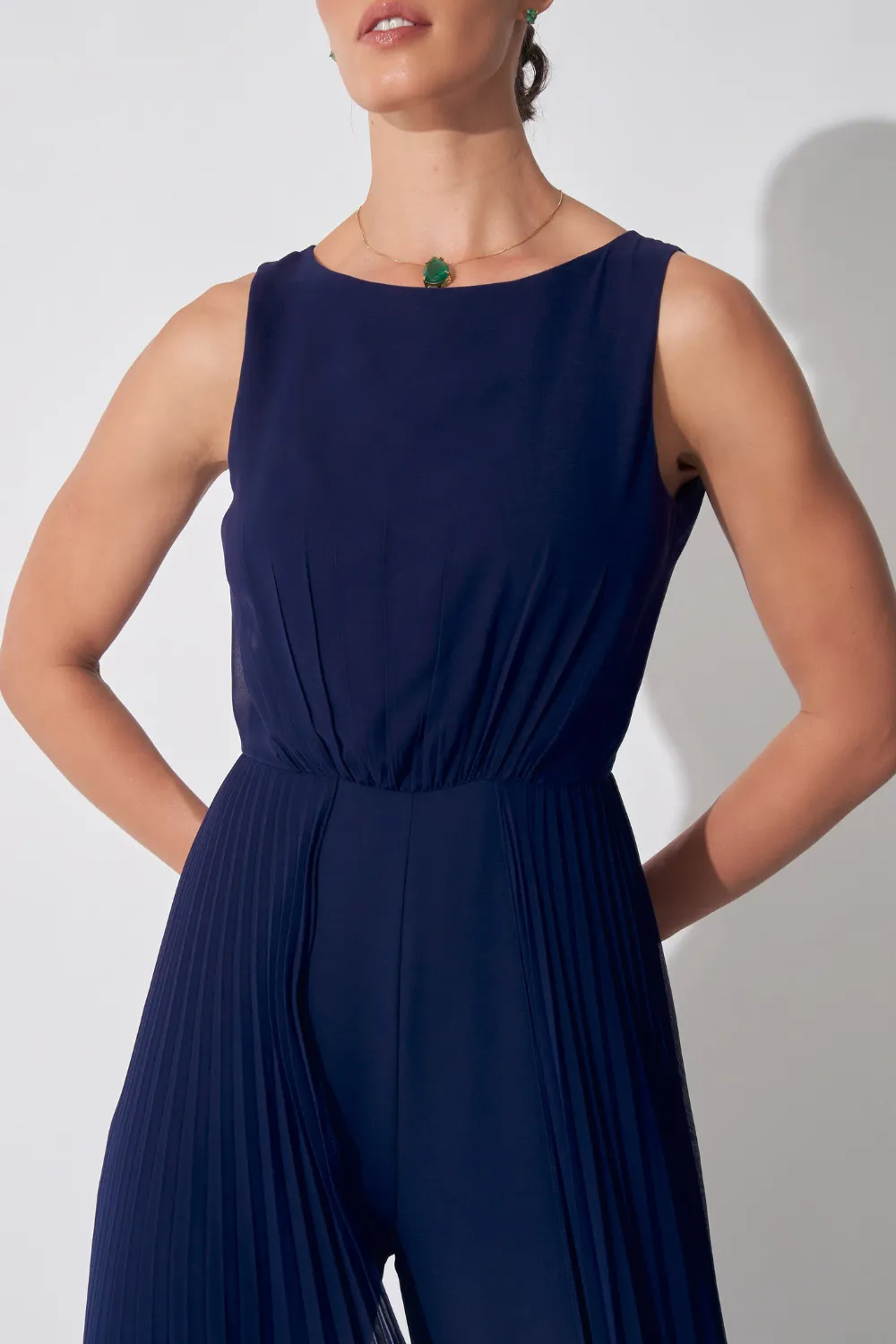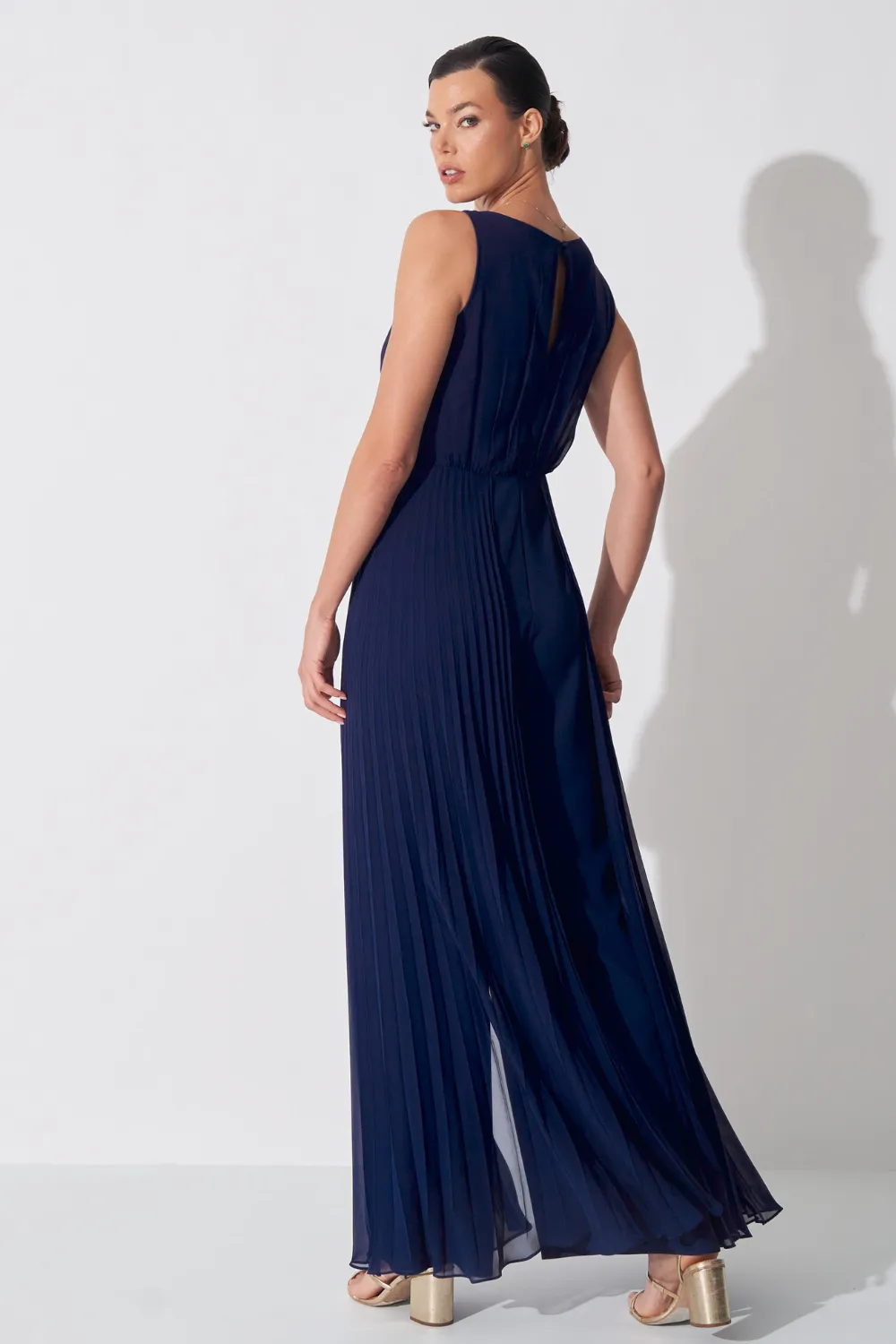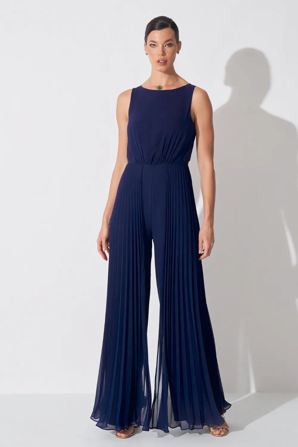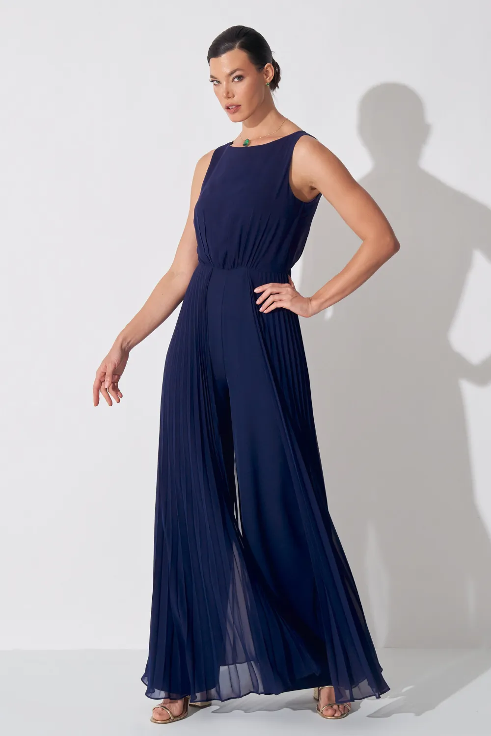 Ficha técnica: 100% poliéster. Corpo em crepe alfaiataria com sobreposição e laterais em chiffon plissado. Modelagem pantalona, decote canoa, franzido na cintura frontal e posterior. Caimento leve e elegante. Origem: nacional. Cuidados: lavar à mão com sabão neutro, não torcer, secar pendurado à sombra e passar a vapor em temperatura baixa pelo avesso.