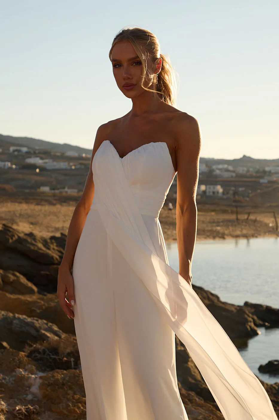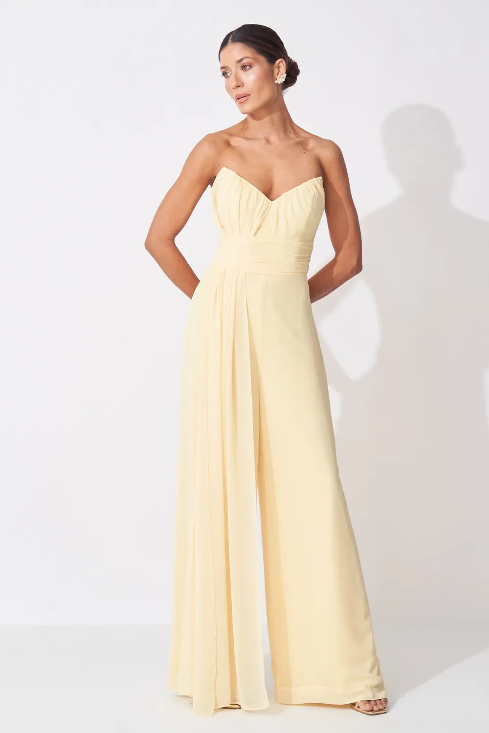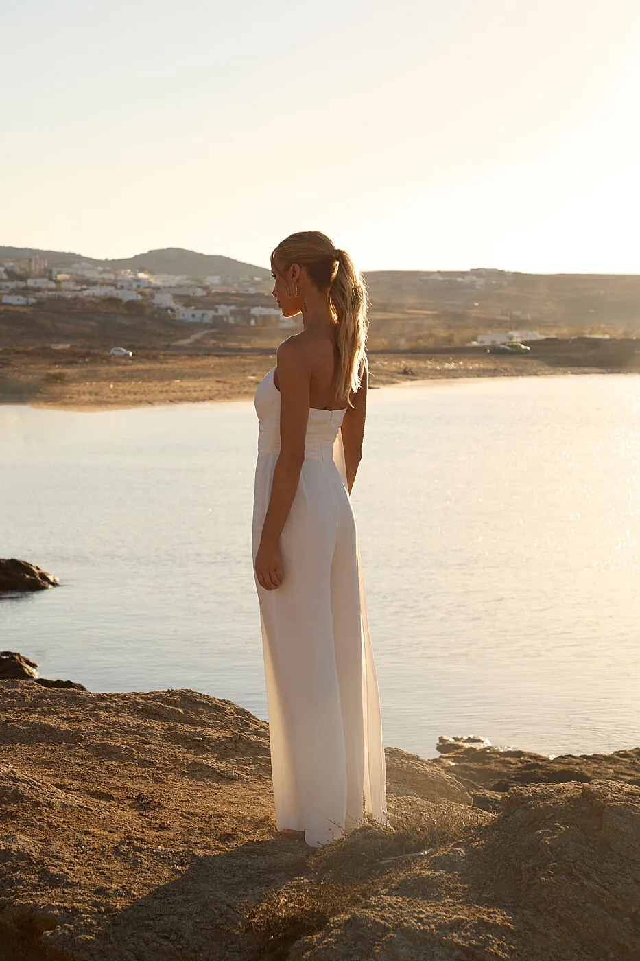 O Macacão Charlotte é a união perfeita entre elegância e versatilidade, pensado para mulheres que desejam um visual sofisticado sem abrir mão do conforto. Confeccionado em chiffon 100% poliéster, ele apresenta caimento leve e fluido, ideal para movimentos graciosos e um toque de feminilidade natural. O busto sem alças valoriza o colo de forma delicada, com detalhe franzido que adiciona textura e charme ao design. O grande diferencial está na faixa solta na parte frontal, que pode ser usada de diferentes maneiras — por baixo do franzido para um efeito mais limpo e contemporâneo, ou por cima, criando um destaque elegante que marca a cintura e alonga a silhueta. A calça de modelagem reta completa o visual com proporções equilibradas e um toque atemporal. É uma peça prática, elegante e versátil, perfeita para eventos diurnos, jantares sofisticados ou celebrações especiais.