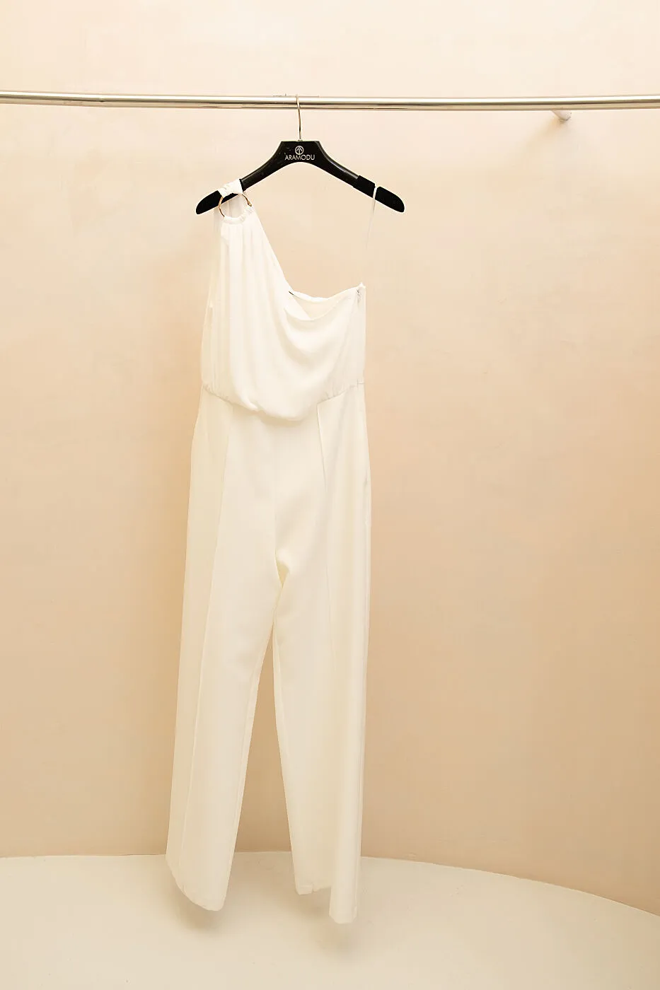 Ficha técnica: macacão confeccionado em tecido de alfaiataria, composição não informada, modelagem longa com pernas amplas, design assimétrico, detalhe de argola metálica, caimento estruturado e elegante, cor preta, origem nacional. Cuidados de lavagem: lavar à mão ou em ciclo delicado, não usar alvejante, secar à sombra e passar em temperatura baixa.