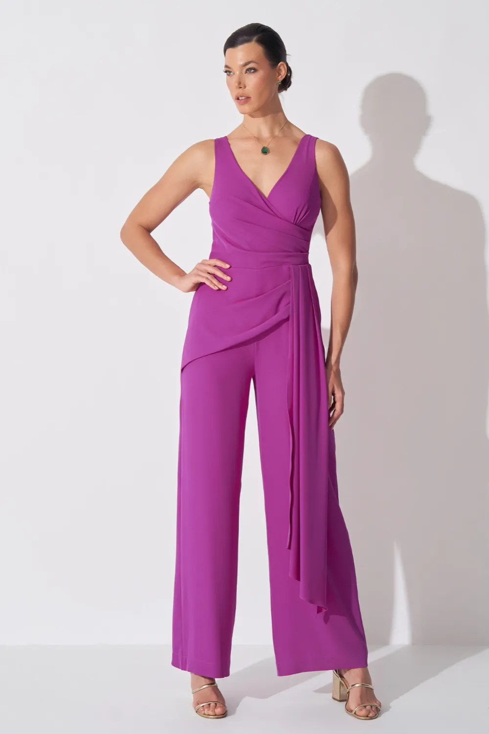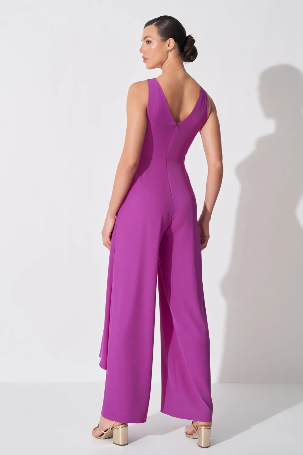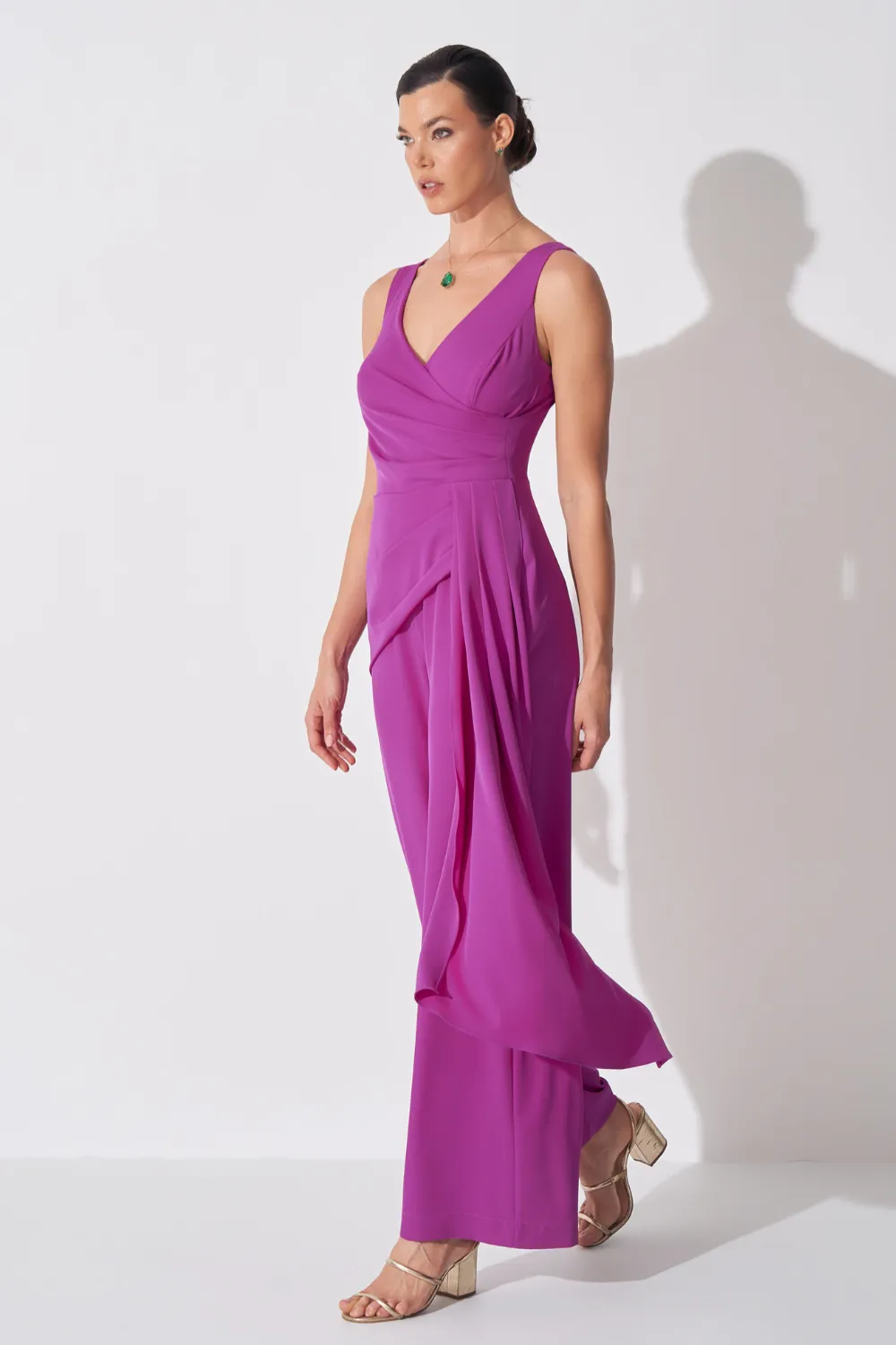 Ficha técnica: confeccionado em crepe encorpado composto por 94% poliéster e 6% elastano, com leve elasticidade e caimento estruturado. Modelagem longa com decote V transpassado, pregas na cintura, calça pantalona e sobreposição frontal plissada. Origem nacional. Requer lavagem delicada à mão, não alvejar e secar à sombra para preservar o caimento e a textura do tecido.