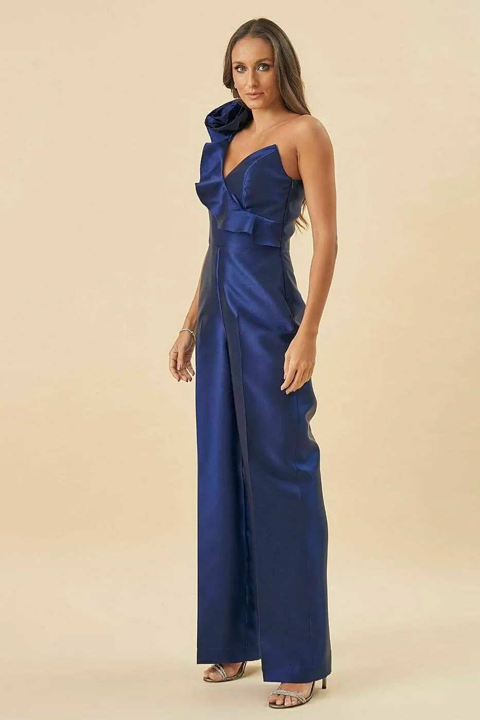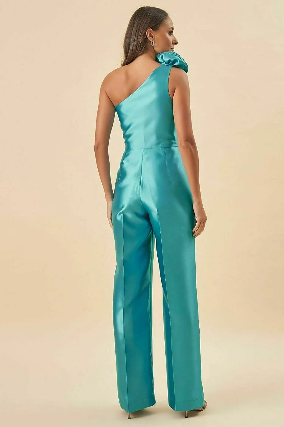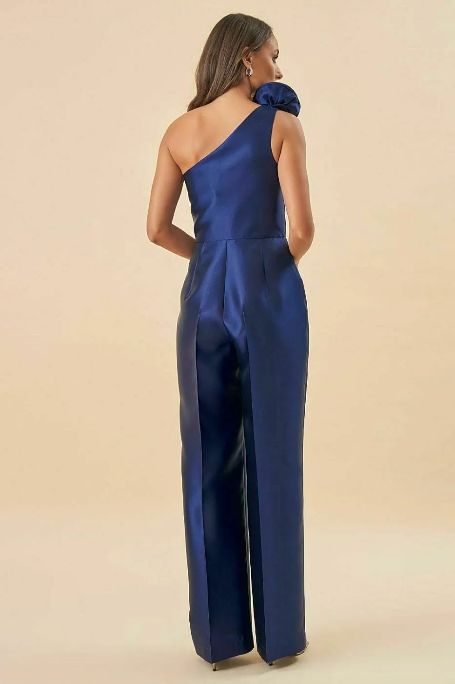 Ficha técnica: 100% poliéster. Tecido em zibeline com estrutura e leve brilho acetinado. Modelagem de um ombro só com flor estruturada aplicada e calça pantalona com pregas nas costas. Zíper posterior embutido. Cor: clássica e sofisticada. Origem: nacional. Cuidados: lavar a seco ou manualmente com sabão neutro, não torcer, secar pendurado à sombra e passar em temperatura baixa pelo avesso.