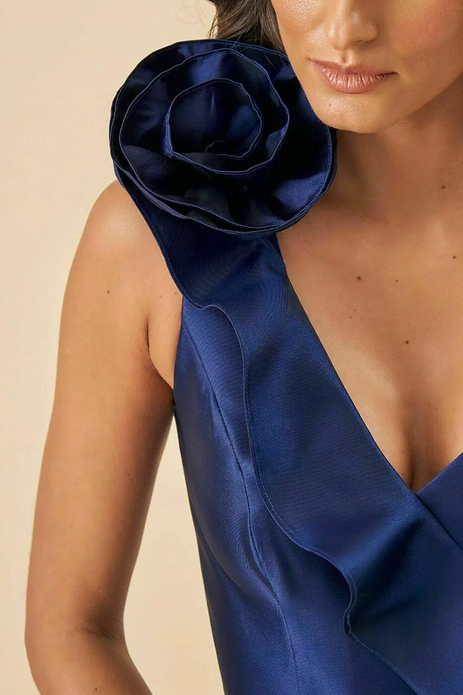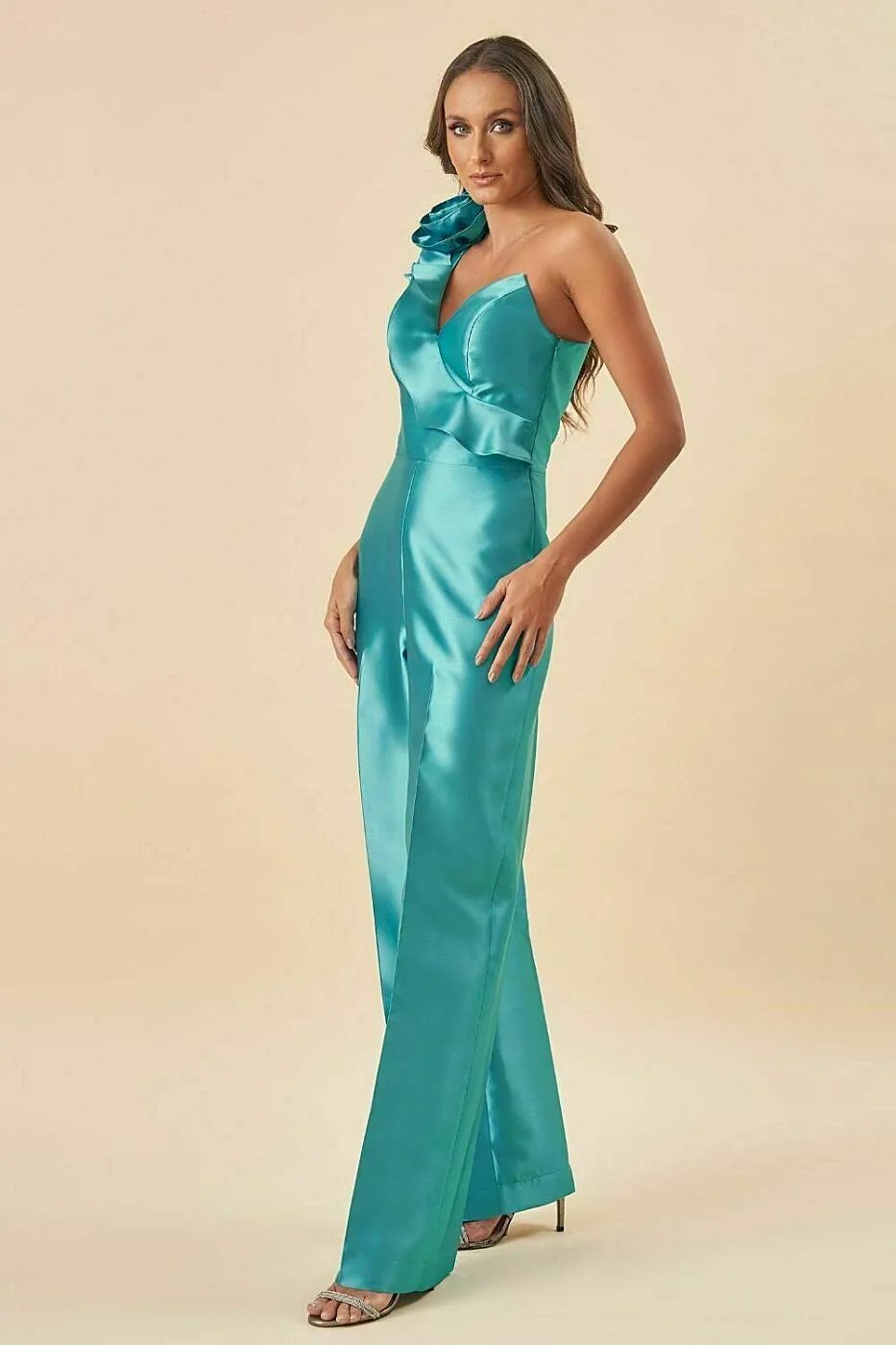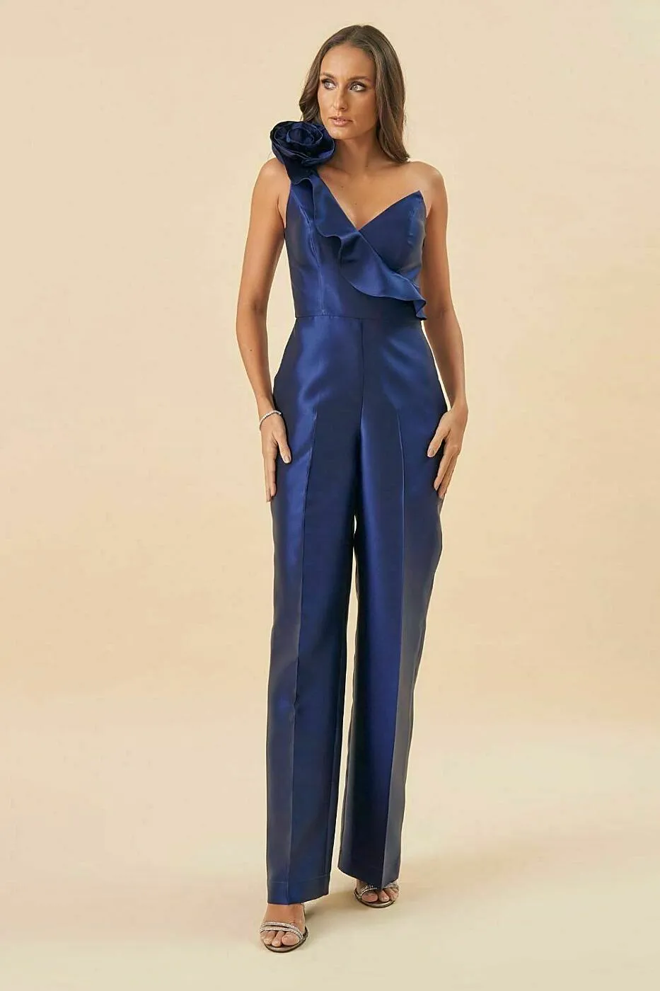 Ficha técnica: 100% poliéster. Tecido em zibeline com estrutura e leve brilho acetinado. Modelagem de um ombro só com flor estruturada aplicada e calça pantalona com pregas nas costas. Zíper posterior embutido. Cor: clássica e sofisticada. Origem: nacional. Cuidados: lavar a seco ou manualmente com sabão neutro, não torcer, secar pendurado à sombra e passar em temperatura baixa pelo avesso.