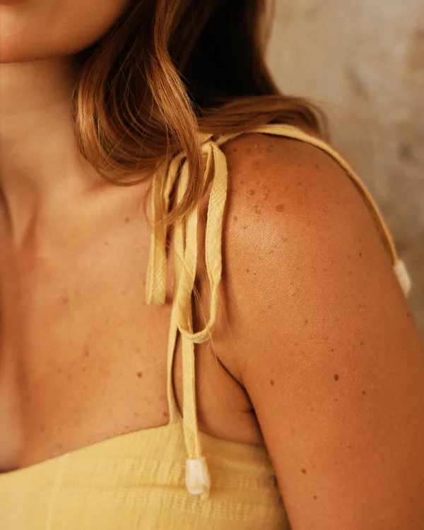 A regata bonne kaele reúne conforto e sofisticação em um design minimalista com alças de amarração e tecido texturizado. O caimento solto acompanha o corpo sem marcar e, assim, garante um visual polido nos dias quentes, do trabalho ao fim de semana.