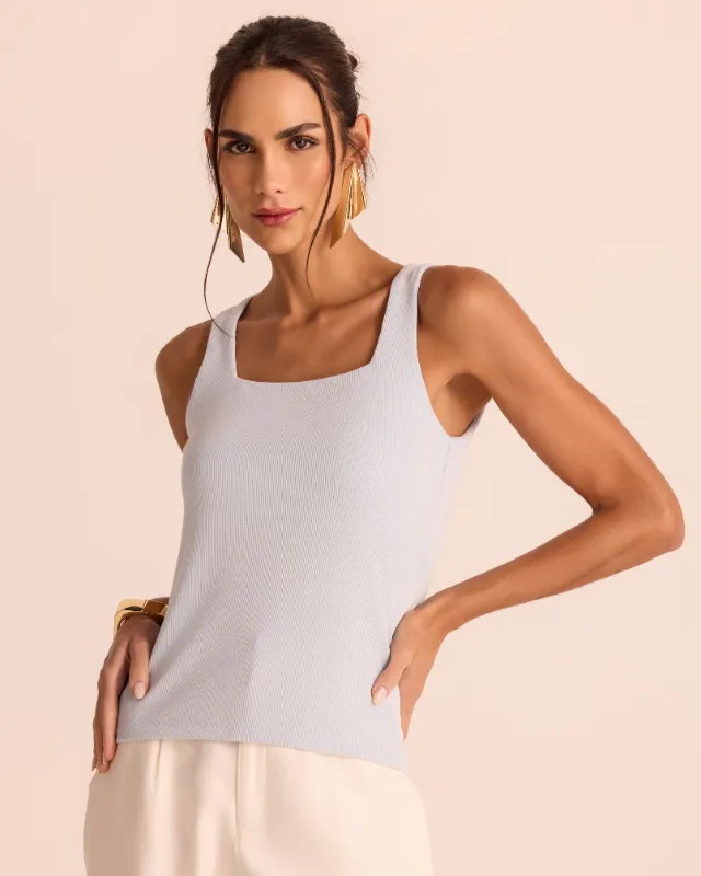 Ficha técnica: regata confeccionada em malha ribana canelada, 64% poliéster, 34% viscose e 2% elastano, sem forro, modelagem ajustada, decote quadrado, alças médias, cor azul claro, origem nacional. Cuidados de lavagem: lavar à mão ou em ciclo delicado, não usar alvejante, secar à sombra e passar em temperatura baixa.
