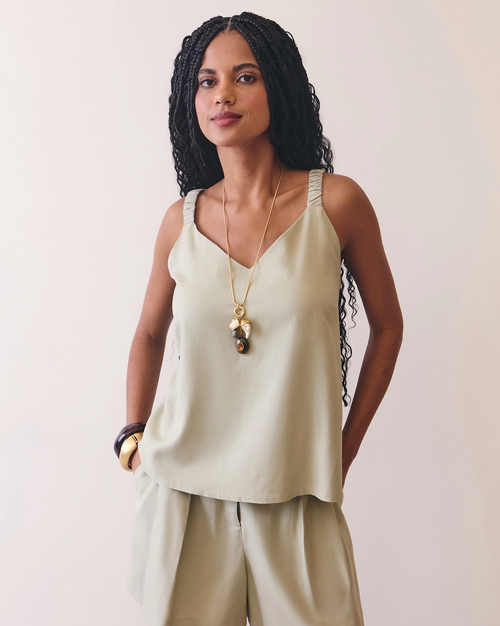Ficha técnica: tecido composto por 85% viscose e 15% linho; modelagem reta e fluida; decote em V; alças com detalhe em elástico; sem forro; cor bege claro; origem nacional; cuidados de lavagem: lavar à mão com sabão neutro, não torcer, secar à sombra e passar em temperatura baixa.