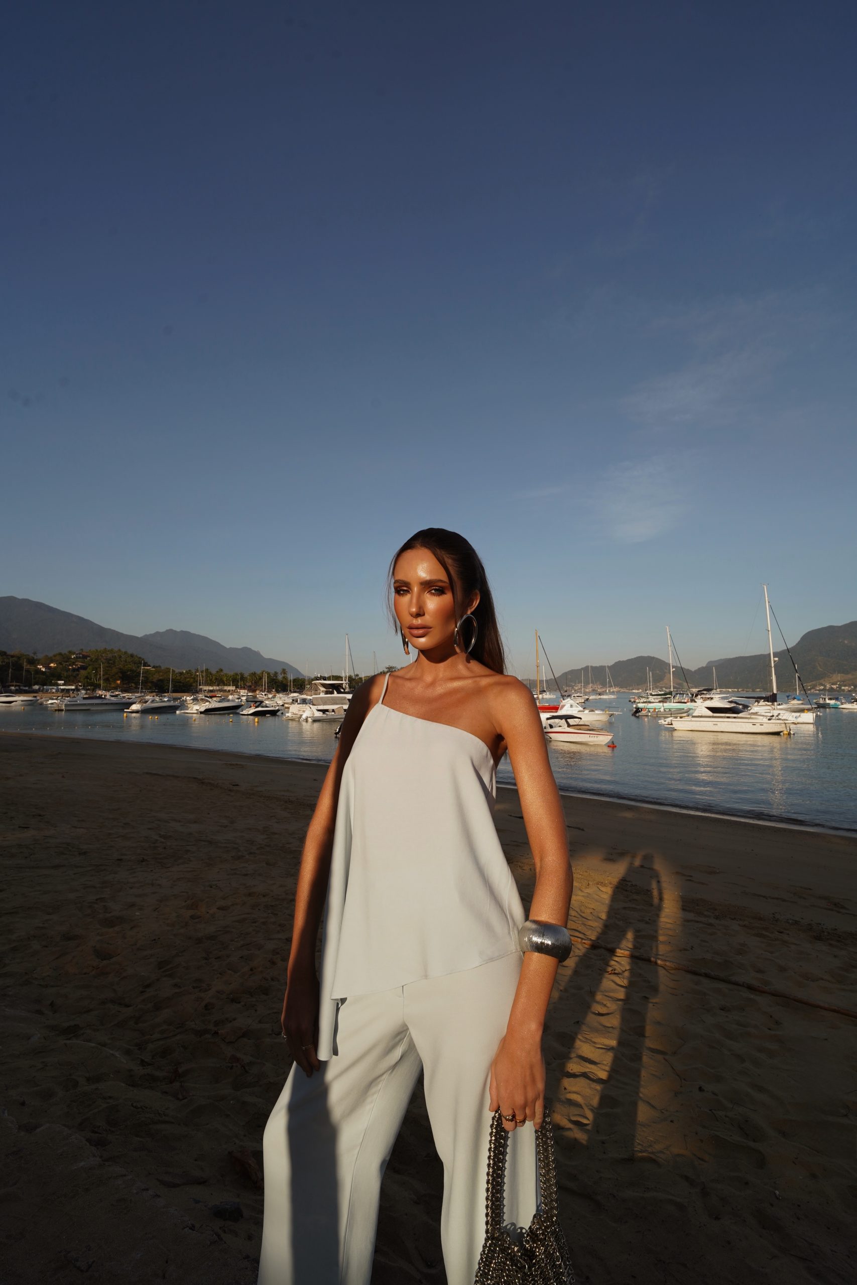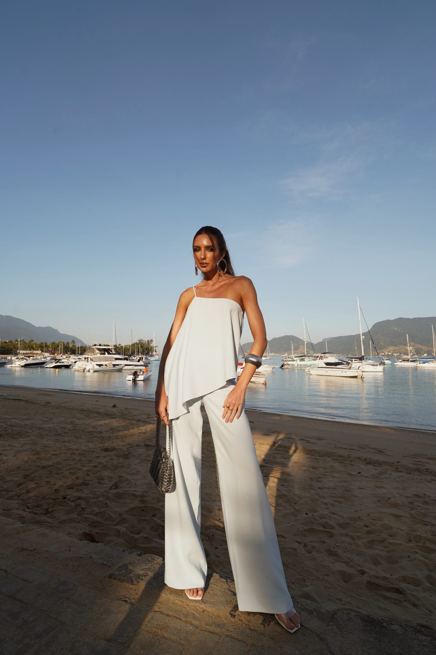A regata Janna é a tradução perfeita do minimalismo sofisticado. Confeccionada em tecido leve e fluido, ela tem um caimento impecável que valoriza o movimento natural do corpo. O design de alças finas e o recorte assimétrico conferem modernidade e elegância, transformando uma peça básica em um item de destaque no guarda-roupa. O tecido de toque acetinado traz brilho sutil e textura refinada, enquanto o tom azul claro transmite frescor e leveza — ideal para dias ensolarados e produções sofisticadas com toque contemporâneo.