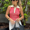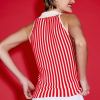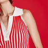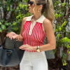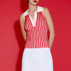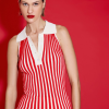 Vestido curto em malha estruturada, que proporciona conforto e um caimento impecável. O design combina a parte superior com listras verticais em vermelho e branco, decote em gola polo com abotoamento, trazendo um ar esportivo e sofisticado.