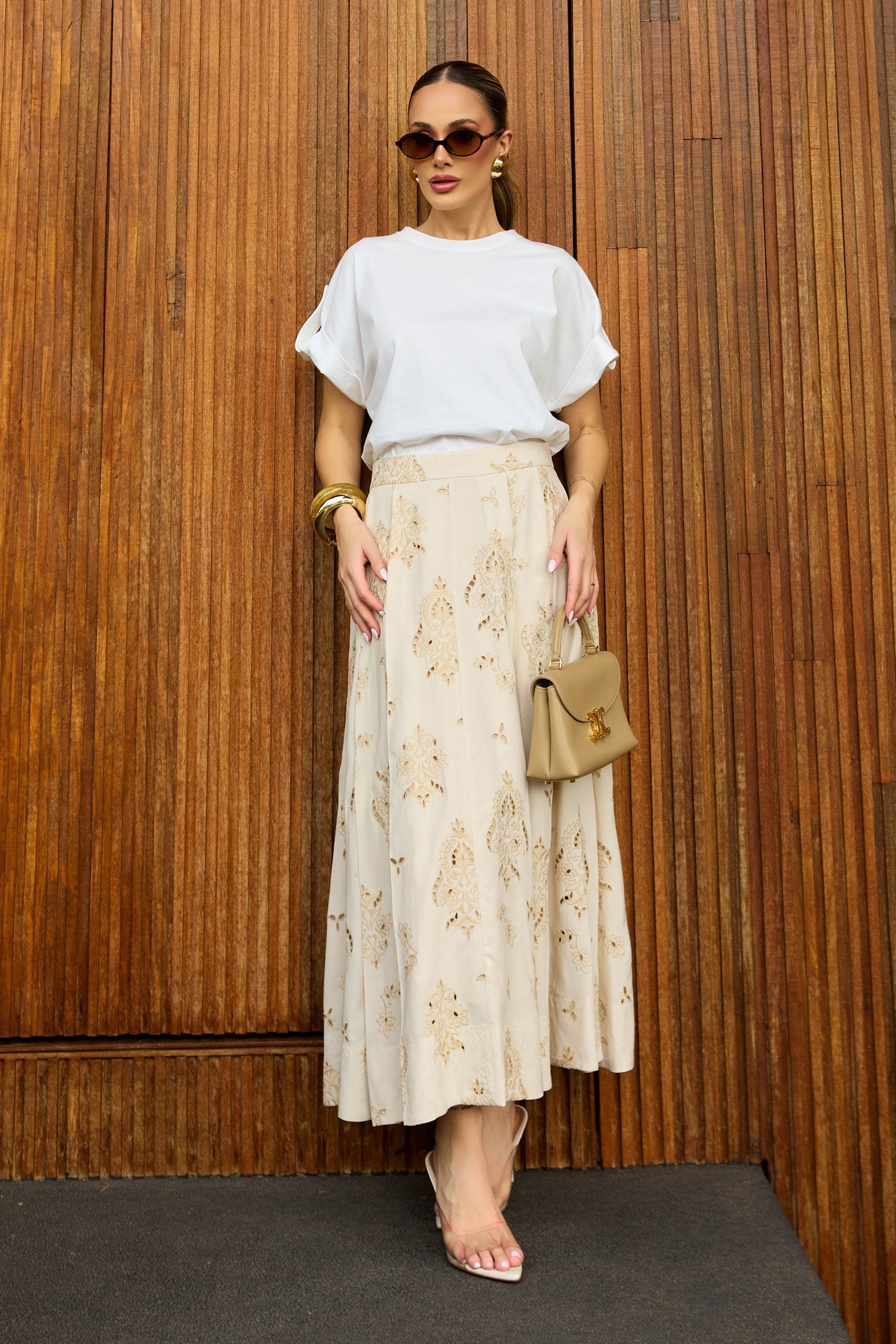 Saia confeccionada em laise, com caimento estruturado que valoriza o visual com elegância. Apresenta cós, prega dupla frontal e recortes frontal e posterior, que garantem melhor ajuste e acabamento refinado. O fechamento é feito por zíper invisível na lateral, proporcionando praticidade e discrição. Versátil e sofisticada, é a escolha perfeita para compor produções casuais ou elegantes. Modelo veste: P Altura da modelo: 1,65