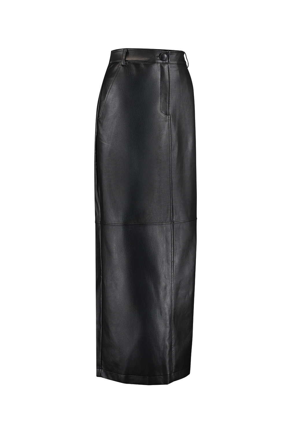 Ficha técnica: saia longa feminina confeccionada em couro PU, base 100% viscose com revestimento 100% poliuretano, modelagem reta, recortes estratégicos, fenda traseira, cintura média, sem forro adicional, cor preta, peça de origem nacional, com cuidados de limpeza a seco ou limpeza especializada para materiais sintéticos, não lavar em máquina e não passar a ferro.