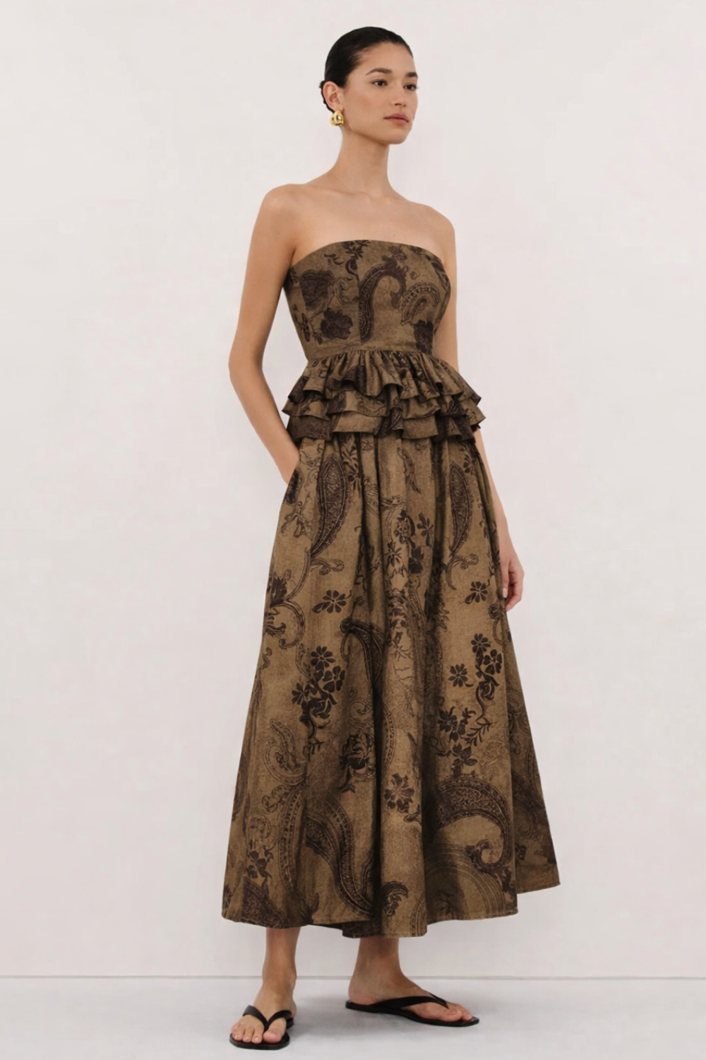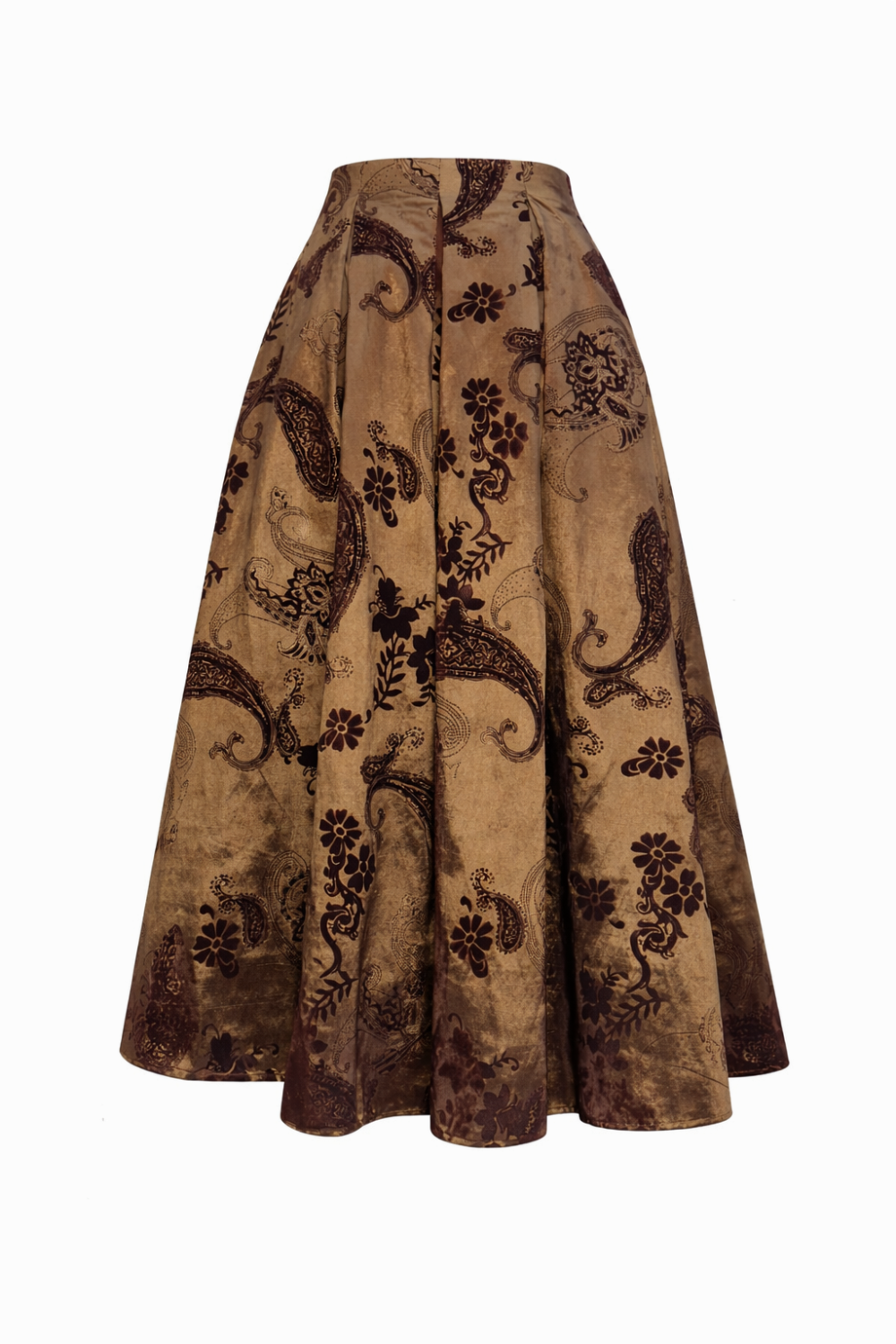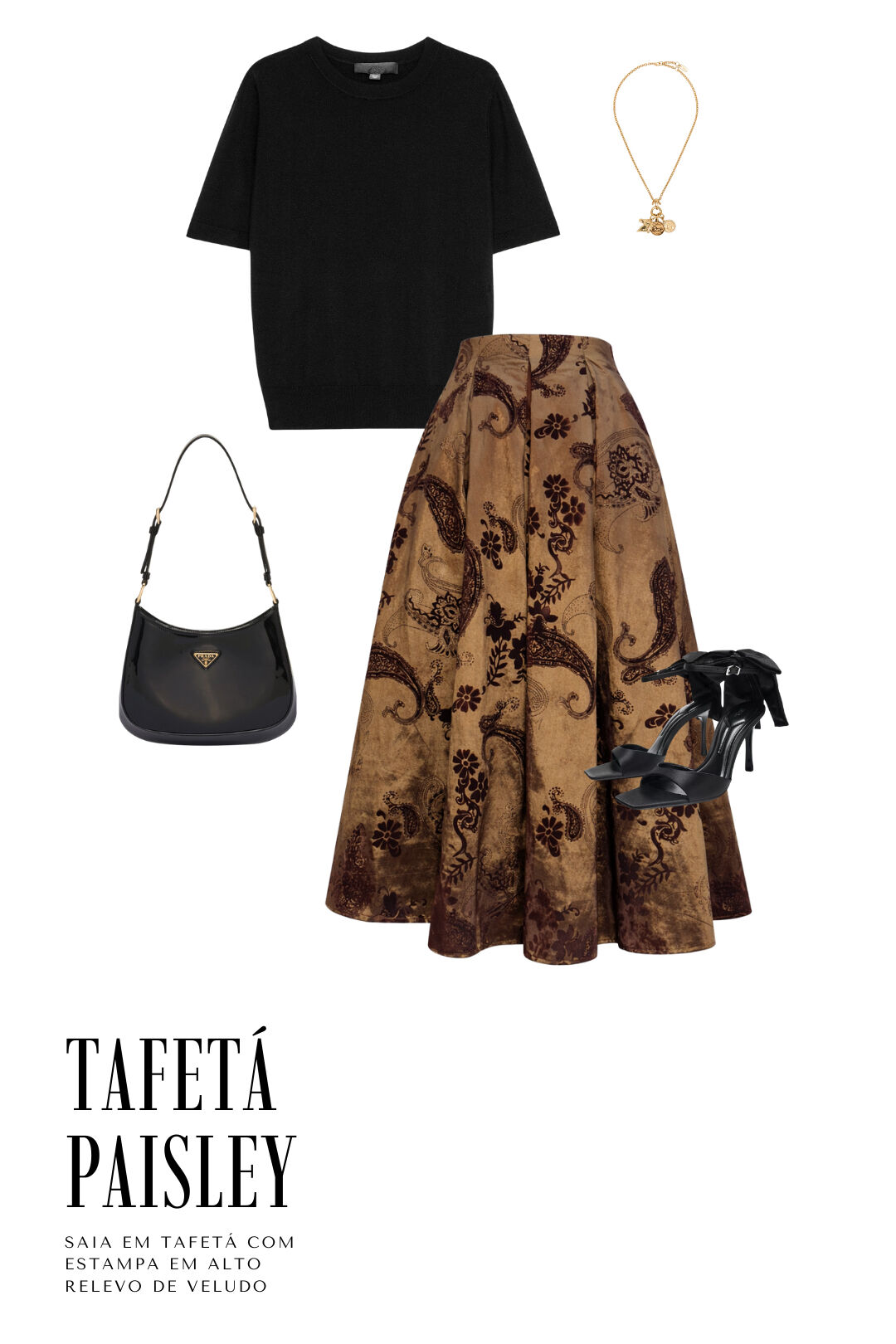 Ficha técnica: saia midi feminina confeccionada em tecido encorpado de acabamento sofisticado, sem forro, modelagem midi com volume e cintura marcada, estampa ornamental em tons contrastantes, origem nacional, cuidados de lavagem recomendados a seco ou lavagem delicada conforme instruções da etiqueta. 🧺🤍