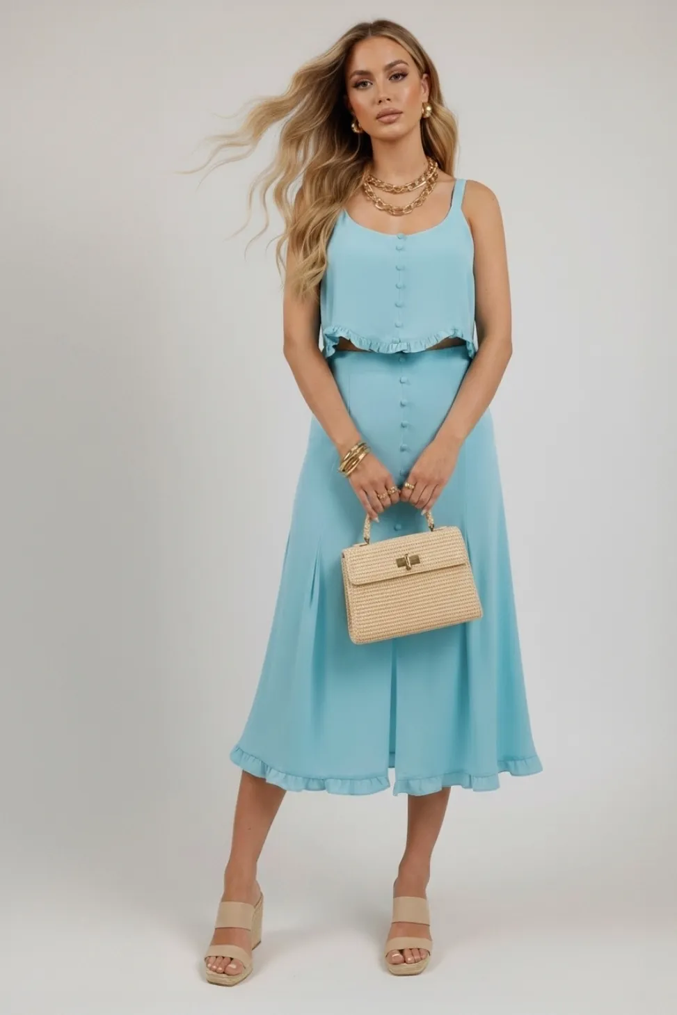 Katarina Hi Twist Crepe – Tecido leve e fluido -Saia midi confeccionada em tecido plano com caimento leve. Apresenta recortes com pregas que garantem movimento e fluidez, além de botões frontais aplicados como detalhe. A barra com babadinhos sutis