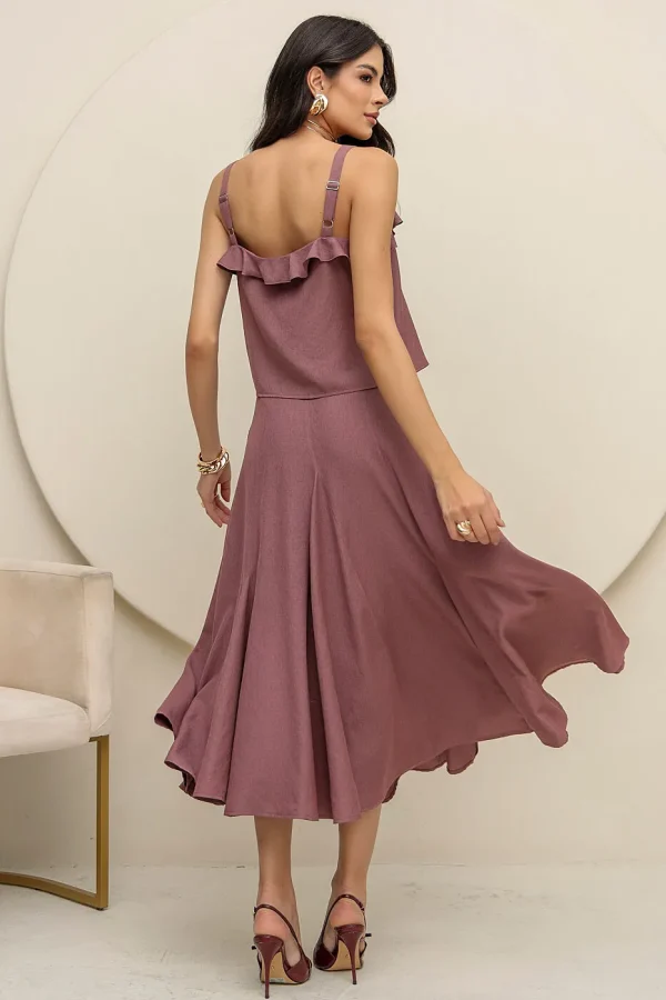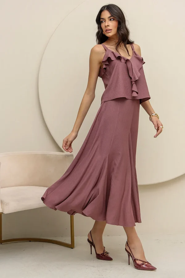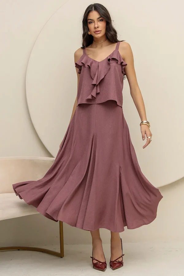Saia midi confeccionada em visco linho de caimento leve, com aspecto rústico e toque confortável, perfeita para quem busca elegância com naturalidade. O design com nesgas adiciona um volume sutil e fluido, criando movimento e sofisticação ao caminhar.
