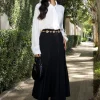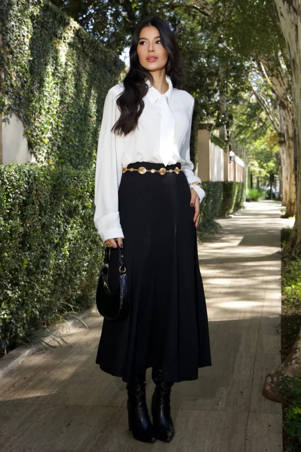 Ficha técnica: Visco Linho – Tecido com caimento leve, aspecto rústico e confortável – Saia midi em visco linho com caimento leve e fluido. O design com nesgas adiciona volume sutil e movimento à peça, criando um visual elegante. O fechamento por zíper invisível