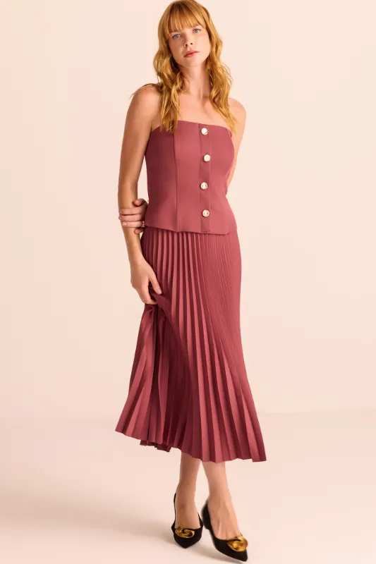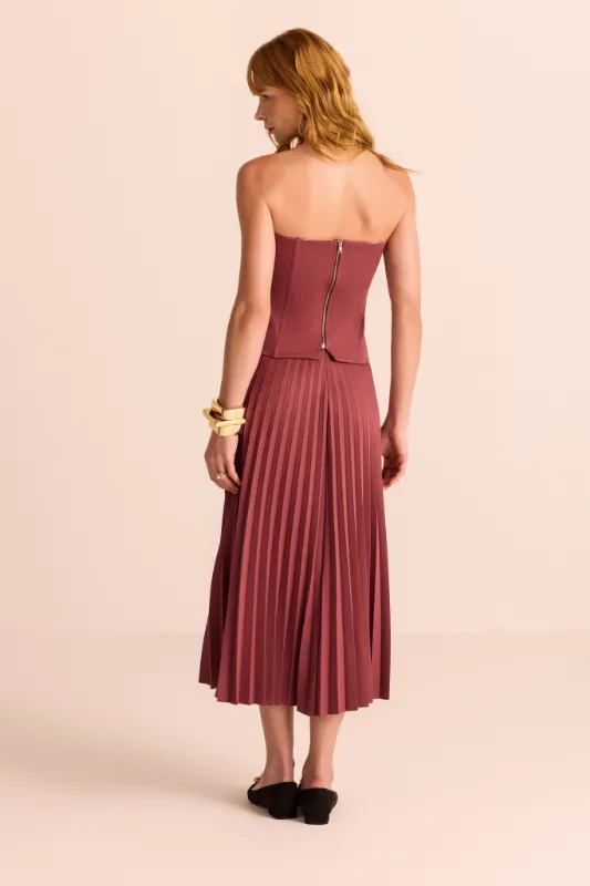 Ficha técnica: saia confeccionada em alfaiataria 94% poliéster e 6% elastano, sem forro, modelagem midi, plissado delicado, caimento fluido, cor vinho, origem nacional. Cuidados de lavagem: lavar à mão ou em ciclo delicado, não usar alvejante, secar à sombra e passar em temperatura baixa, evitando pressionar o plissado.