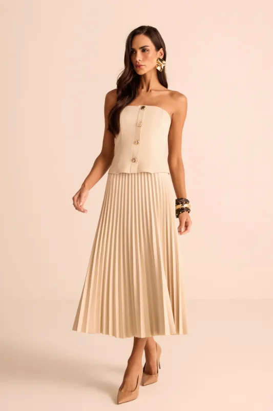 Dica de estilo 💡: combine essa saia midi plissada feminina com um top estruturado ou camisa fluida por dentro da peça e finalize com salto médio ou sapatilhas sofisticadas; para um look ainda mais atual, aposte em acessórios dourados e blazer bem cortado.