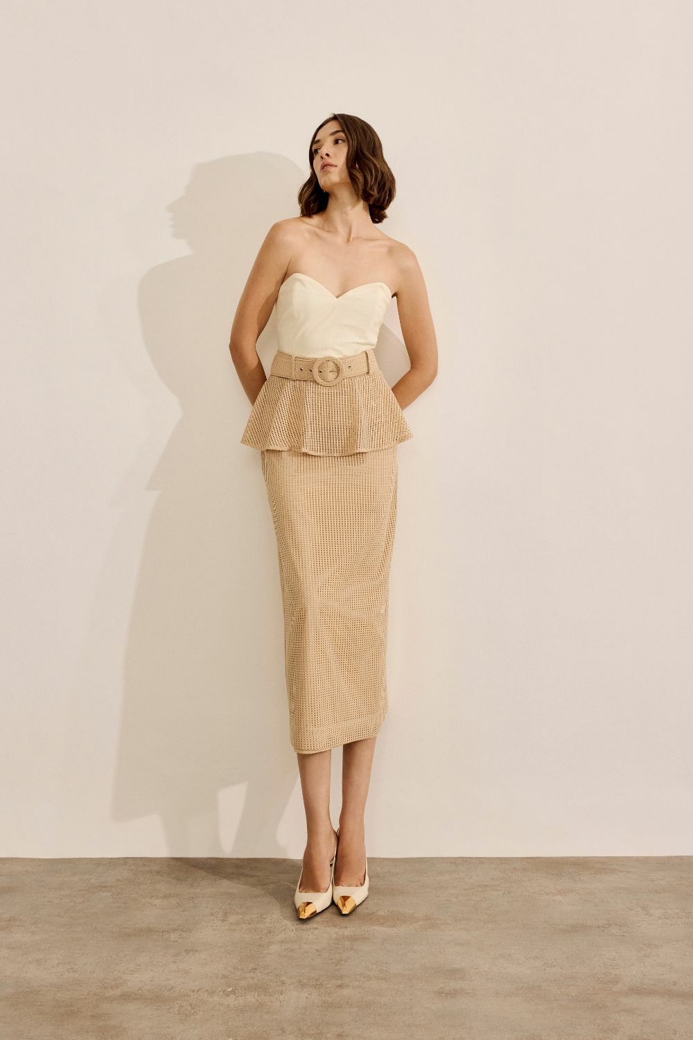Ficha técnica: saia midi confeccionada em tecido de tela com composição de 95% poliéster e 5% elastano, forro em 65% poliéster e 35% algodão, modelagem reta, peplum na cintura, fenda, fechamento por zíper invisível nas costas, acompanha cinto forrado no próprio tecido, cor neutra sofisticada, peça de origem nacional, com cuidados de lavagem à mão ou em ciclo delicado, secagem à sombra e passagem em temperatura baixa para preservar a estrutura e o caimento.