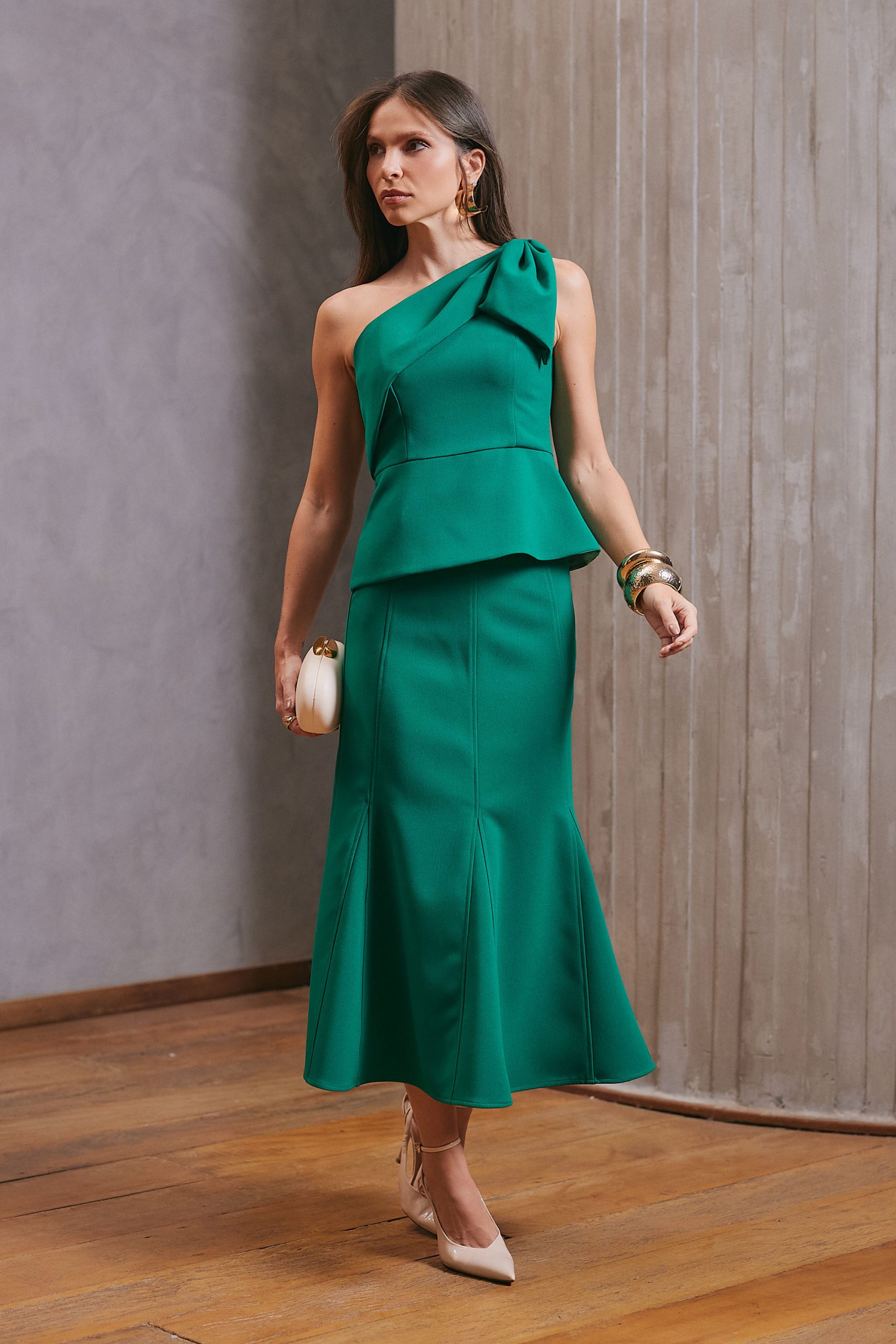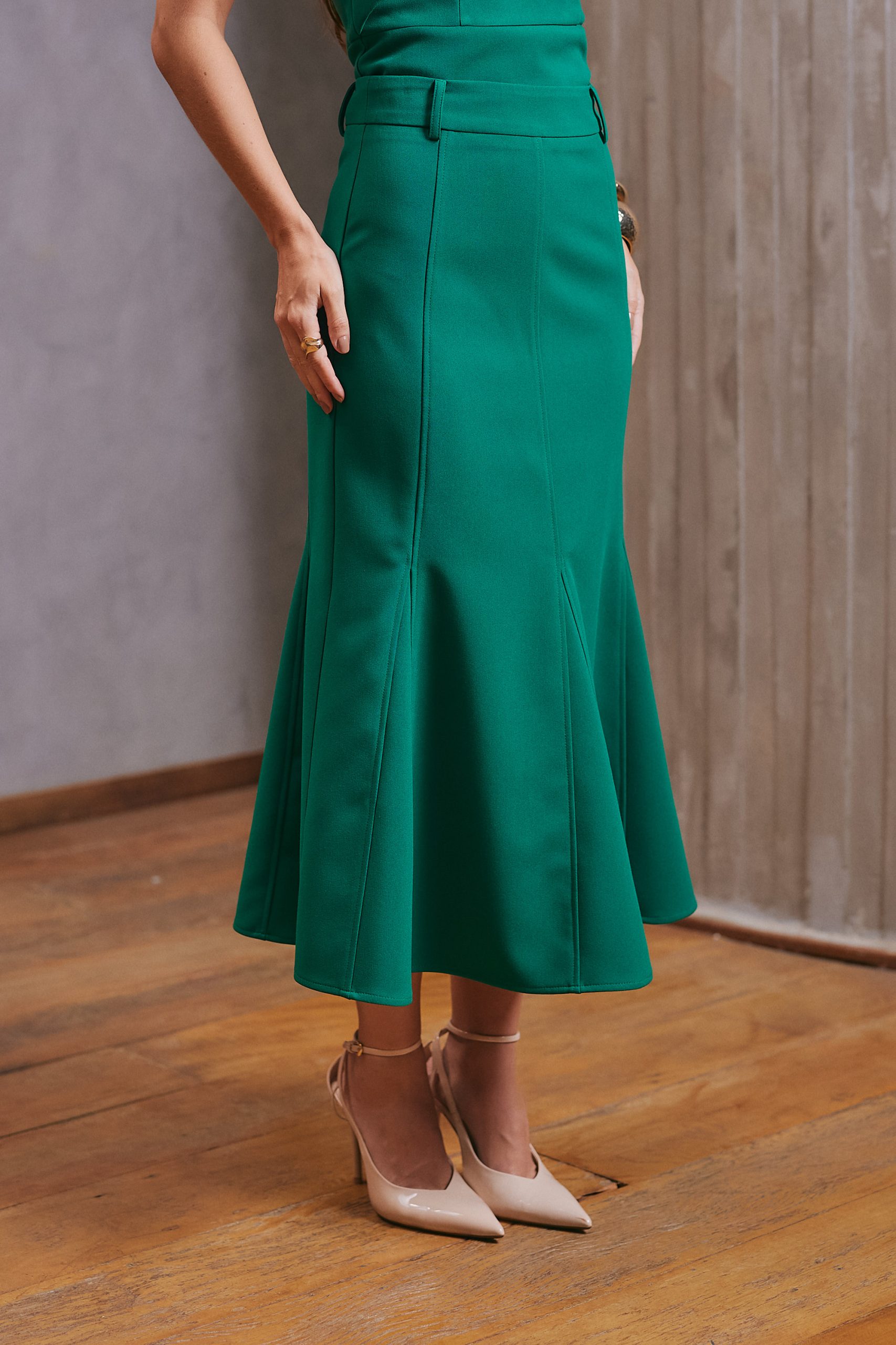 Saia confeccionada em tecido plano, com modelagem de alfaiataria que garante caimento estruturado e elegante. Possui cós com passantes fixos, além de recortes frontais e posteriores que valorizam a silhueta com sofisticação. O fechamento é feito por zíper invisível na lateral, proporcionando um acabamento delicado. Versátil e sofisticada, é a escolha perfeita para compor produções casuais ou elegantes.