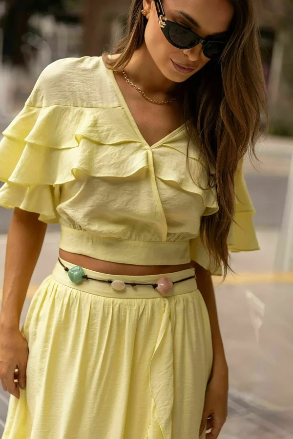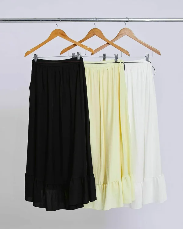 Saia midi evasê em viscose texturizada. Detalhe de transpasse com babados. Acompanha cinto com pedras para amarração. Forrada.