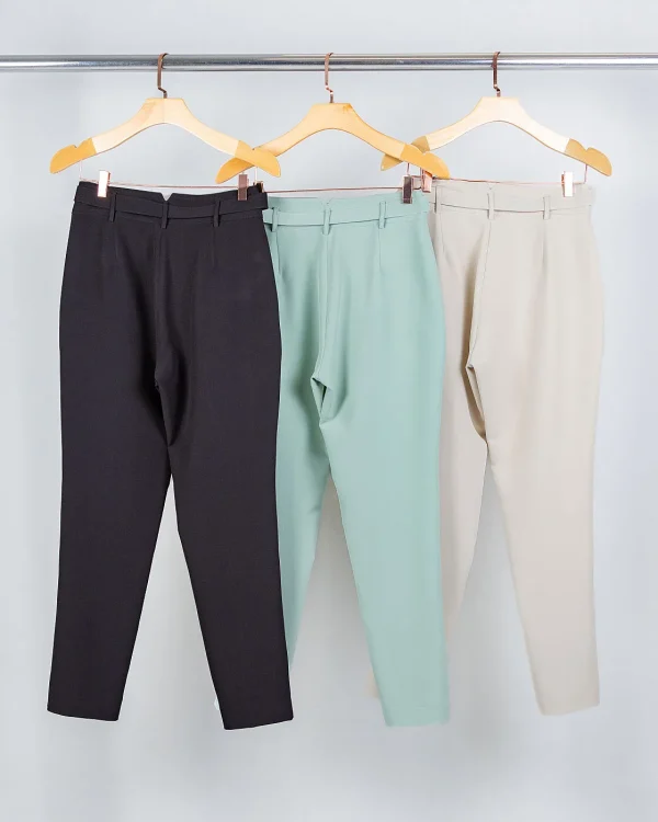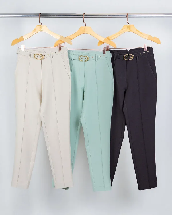 Uma calça de alfaiataria que vai além do básico. O cós transpassado com botão alonga a silhueta, a nervura frontal traz aquele ar elegante e o cinto forrado com fivela dourada dá o toque de sofisticação que transforma a peça em protagonista do look. Confortável, prática e estilosa — perfeita para acompanhar sua rotina com leveza e presença.