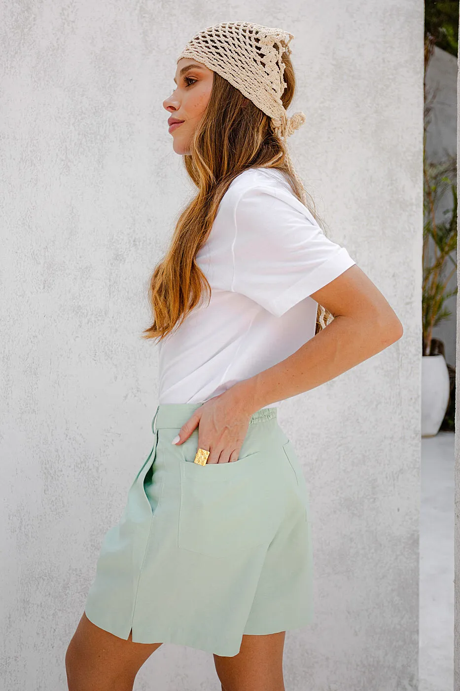 Alfaiataria Avila – Tecido com viscose de toque macio -Shorts de alfaiataria com fenda lateral, bolsos traseiros que valorizam o caimento e pregas frontais que acrescentam sofisticação. O cós com elástico estratégico nas costas garante conforto