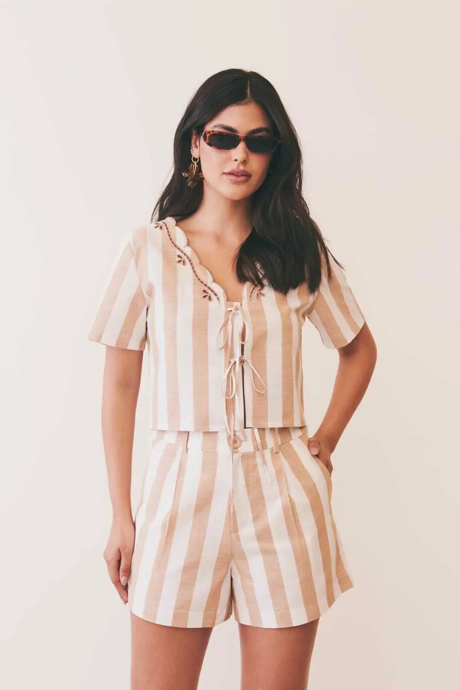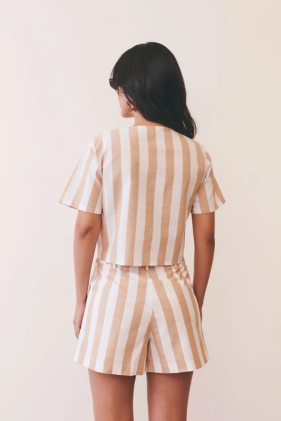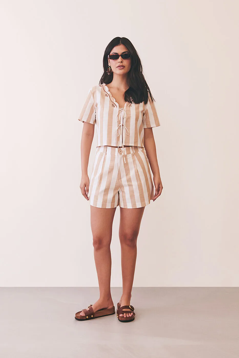 O shorts listras é a tradução do conforto aliado à elegância casual. Confeccionado em tecido leve com mistura de poliéster e algodão, ele tem textura macia e caimento estruturado que valoriza a silhueta de forma natural. A modelagem clássica com cintura média, bolsos laterais e fechamento frontal com botão e zíper garante praticidade, enquanto as listras verticais em tons de areia e off-white alongam o corpo e trazem um ar moderno e sofisticado. É uma peça versátil e charmosa, perfeita para composições frescas e estilosas nos dias mais quentes.
