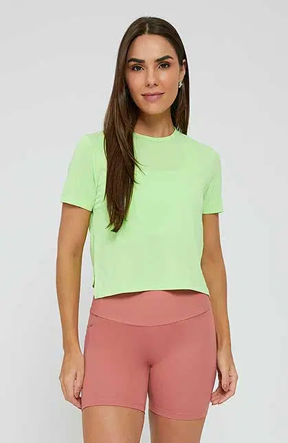 Ficha técnica: confeccionada em poliamida com elastano, tecido leve, respirável e de secagem rápida. Modelagem reta com decote redondo e silk frontal. Cor: verde neon. Origem: nacional. Cuidados: lavar à mão, não usar alvejante, secar à sombra e evitar ferro quente para preservar o silk e a maciez do tecido.