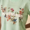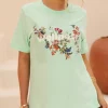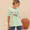 Camiseta com Estampa Floral e Esferas – confeccionada em 100% algodão, com toque macio e caimento confortável. Possui manga curta e estampa floral centralizada com aplicação de esferas, garantindo um visual delicado e feminino.