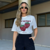 T-shirt em malha de algodão, macia e confortável, perfeita para o dia a dia. O destaque fica para a estampa frontal de morangos com brilho, que traz um toque divertido e fashion à peça.