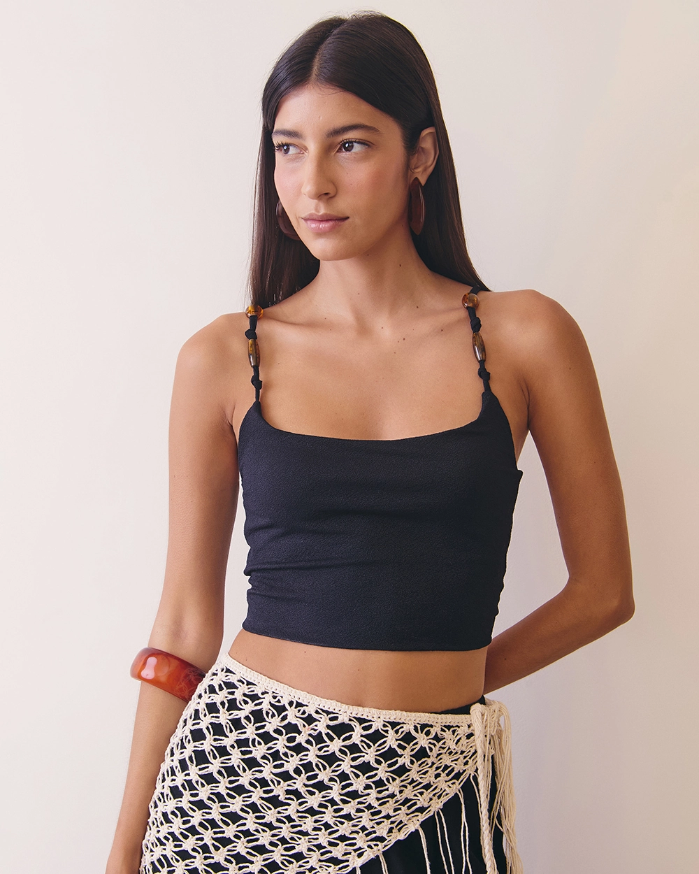 Ficha técnica: 96% elastano, 4% poliamida, tecido com elasticidade leve e toque macio, modelagem justa ao corpo, decote reto, alças finas com nós e miçangas amadeiradas, cor preta, fabricação nacional. Lavar à mão, secar à sombra e não passar sobre os detalhes das alças.