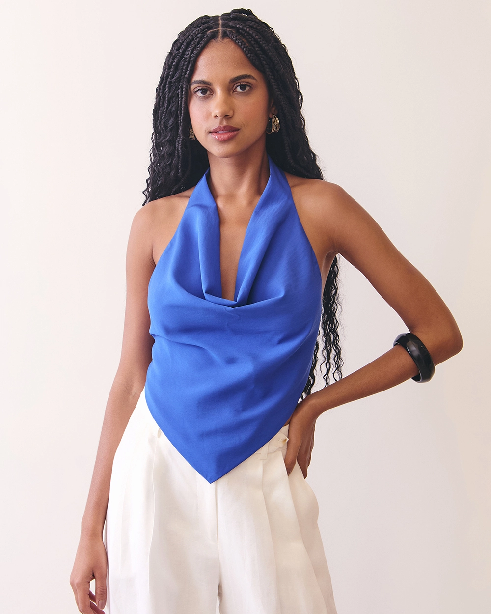 Ficha técnica: tecido composto por 85% viscose e 15% poliamida; modelagem tipo lenço com decote degagé; amarração posterior; cor azul royal; origem nacional; cuidados de lavagem: lavar à mão com sabão neutro, não torcer, secar à sombra e passar em temperatura baixa.