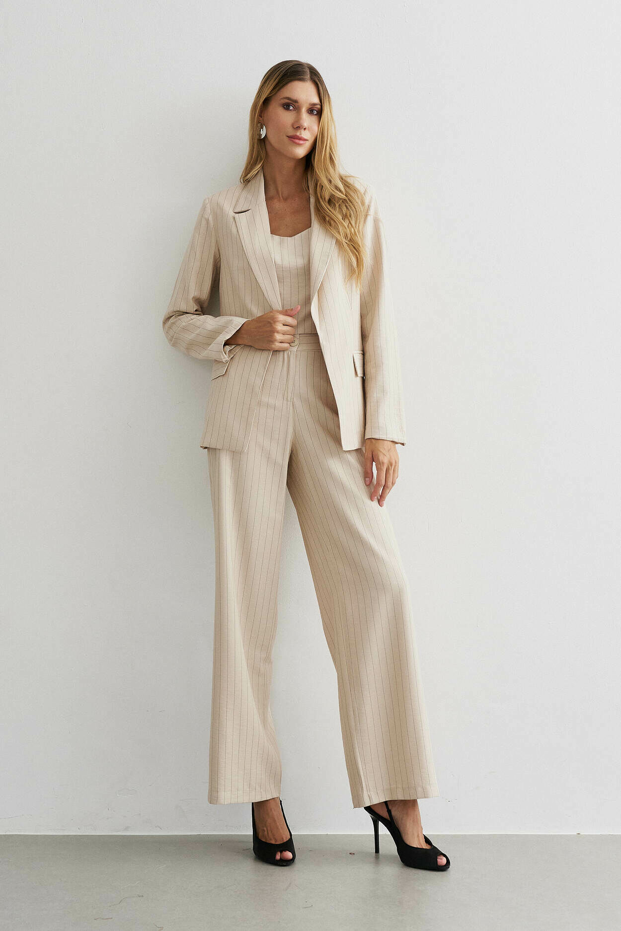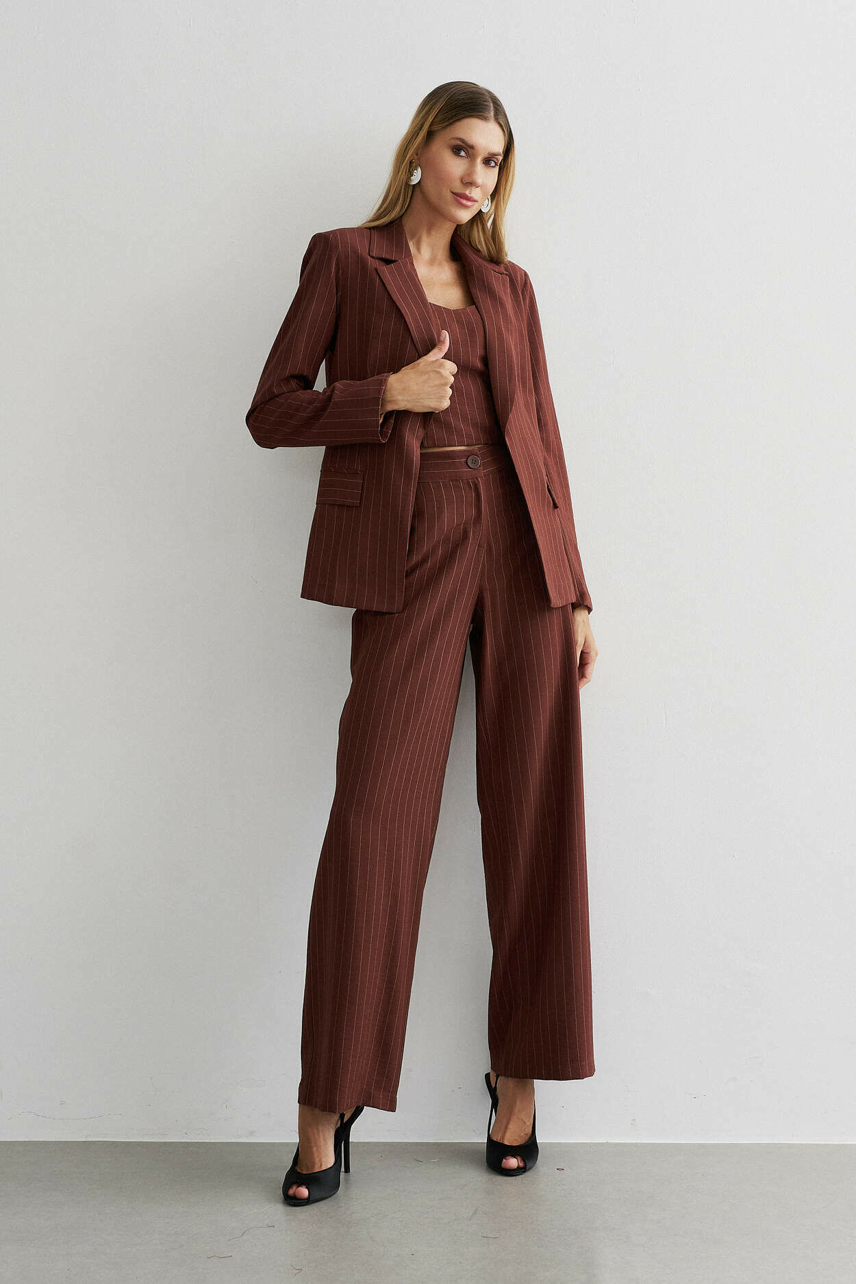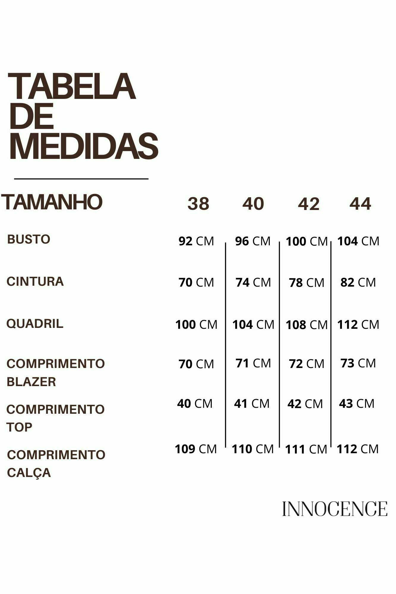 Trio alfaiataria risca de giz. Blazer, cropped com elástico nas costas. Calça pantalona com bolso nas laterais. 91% Viscose 8% Poliamida 1% Poliéster | Forro: 97% Poliéster 3% Elastano