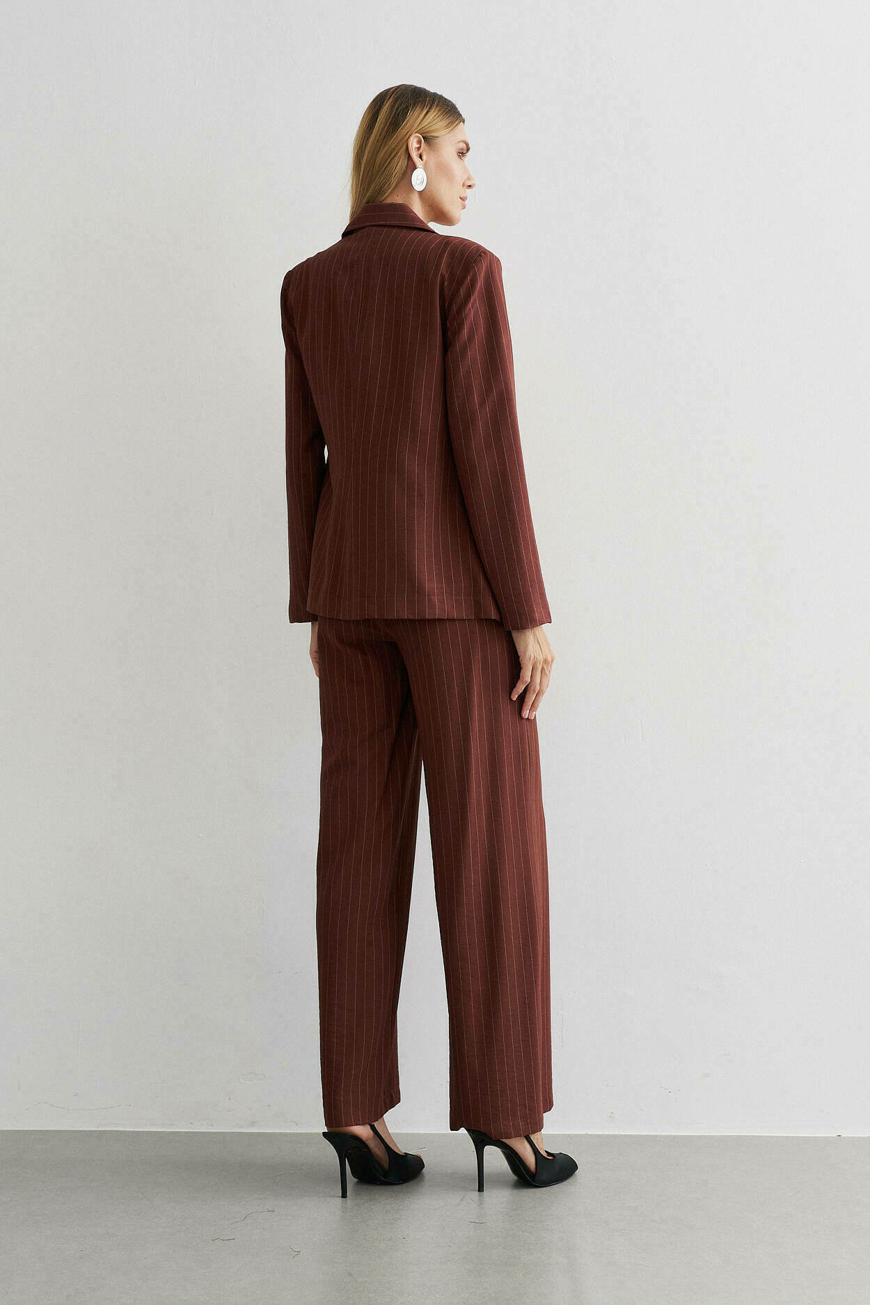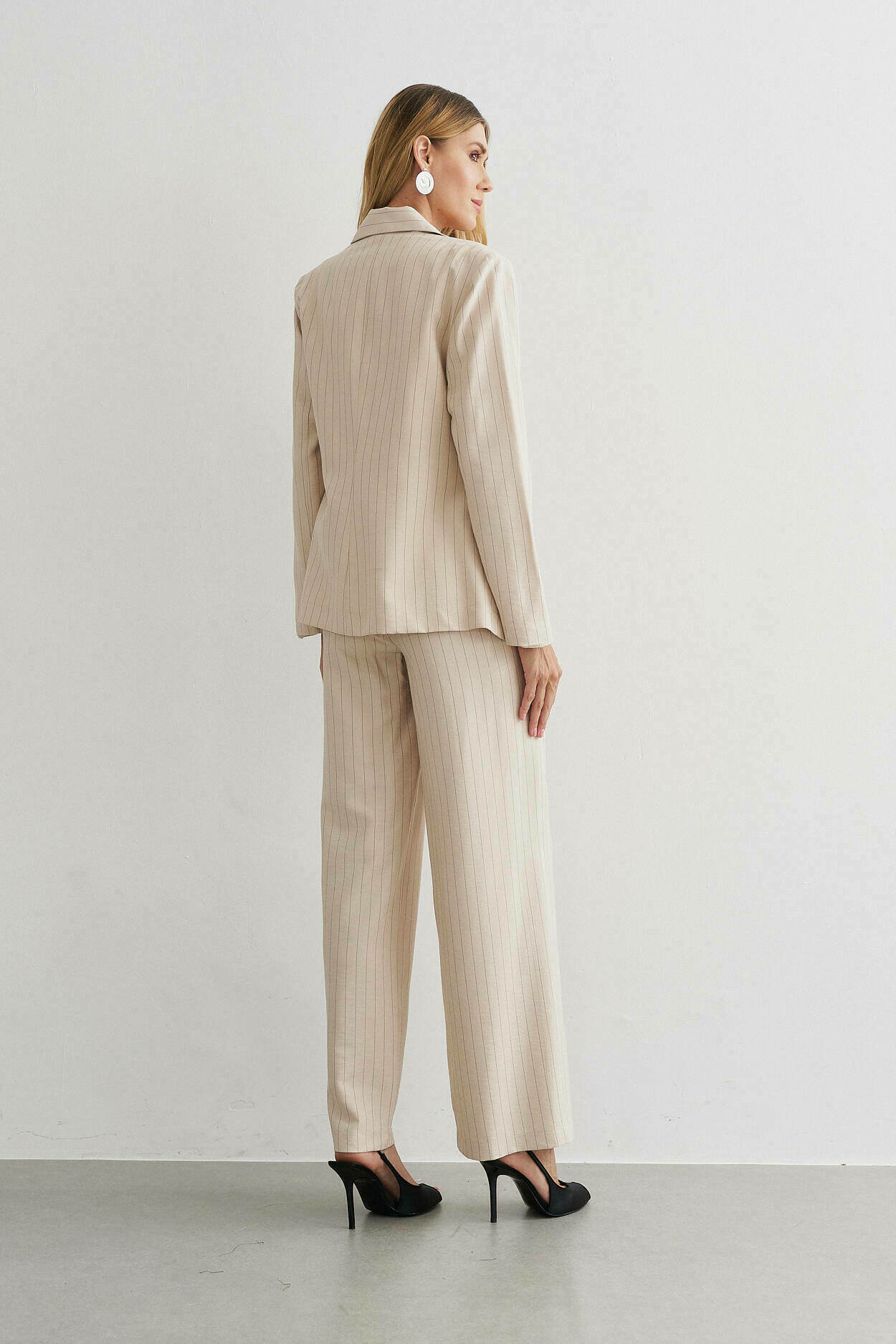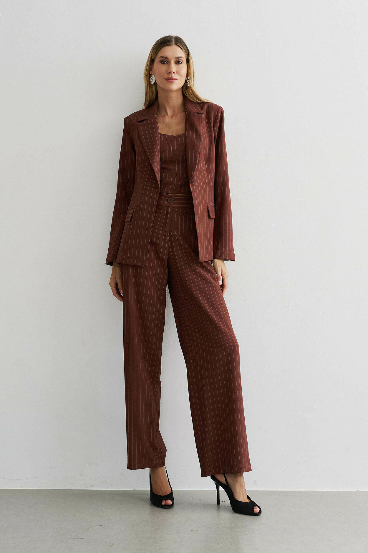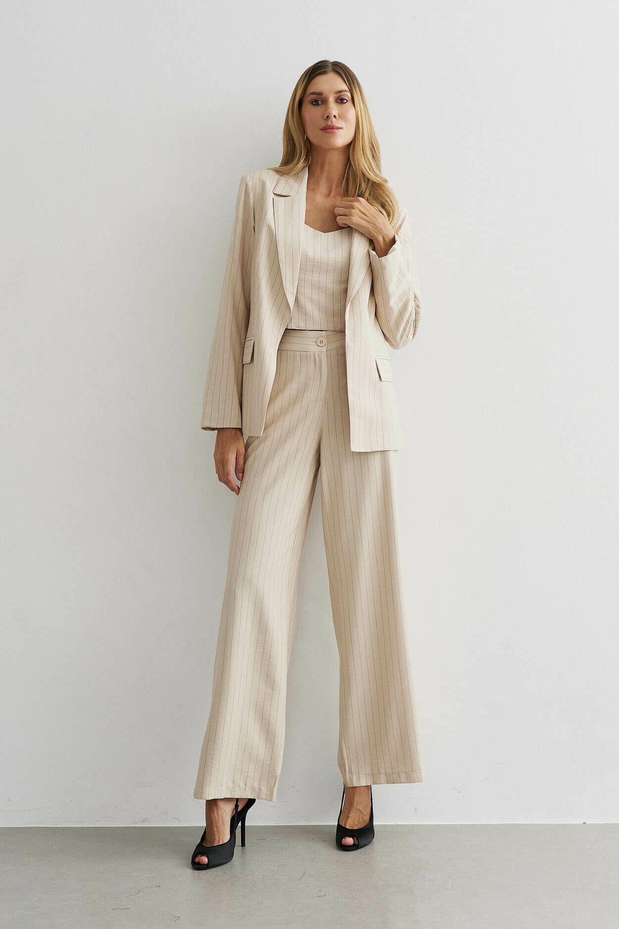Trio alfaiataria risca de giz. Blazer, cropped com elástico nas costas. Calça pantalona com bolso nas laterais. 91% Viscose 8% Poliamida 1% Poliéster | Forro: 97% Poliéster 3% Elastano