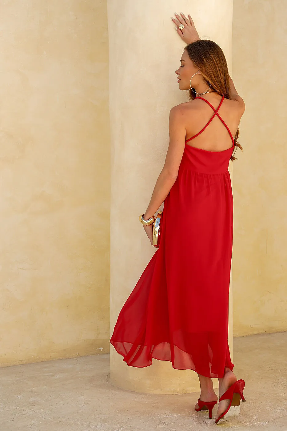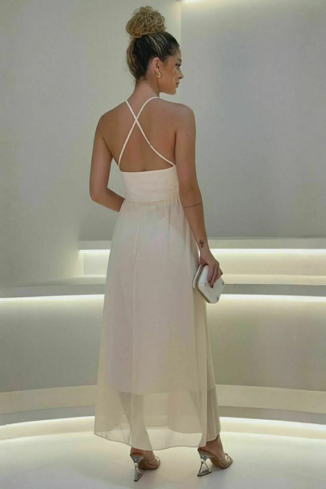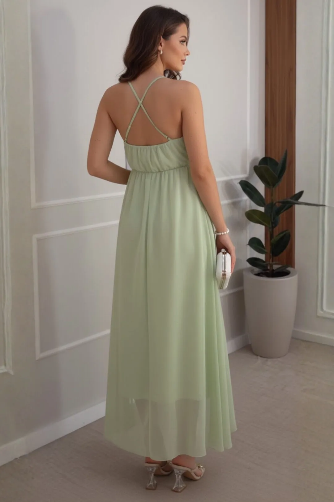 Chiffon Raquel- tecido fluido com transparência – Vestido longo confeccionado em tecido leve, com recorte no busto e frente trabalhada que valoriza o decote. As alças finas possuem cordão interno e passantes metálicos que trazem um toque moderno ao design