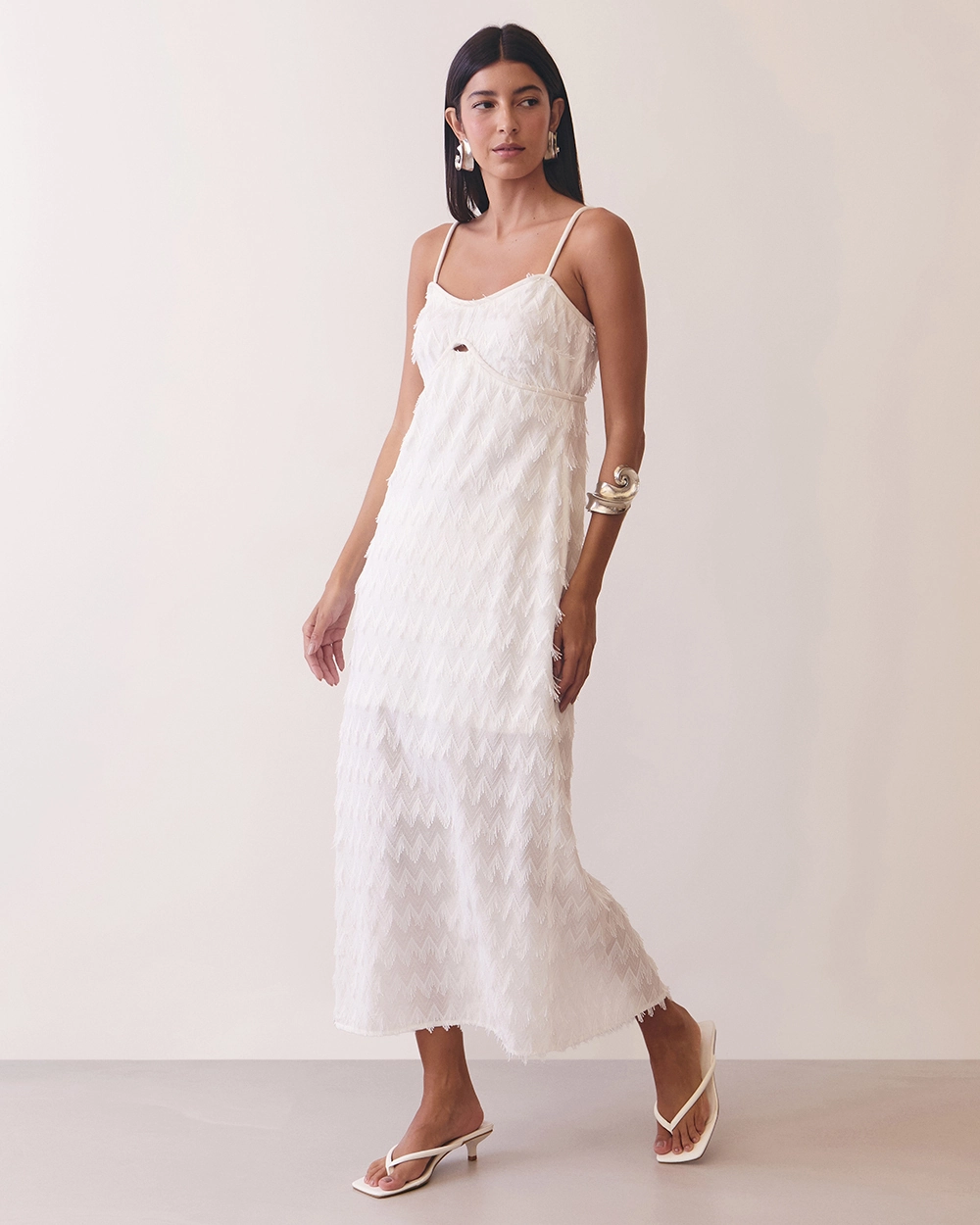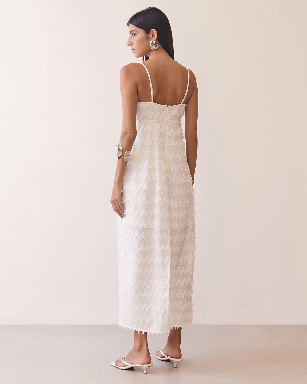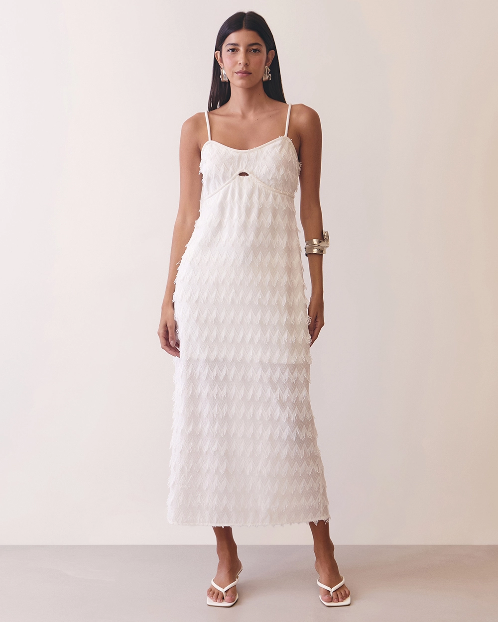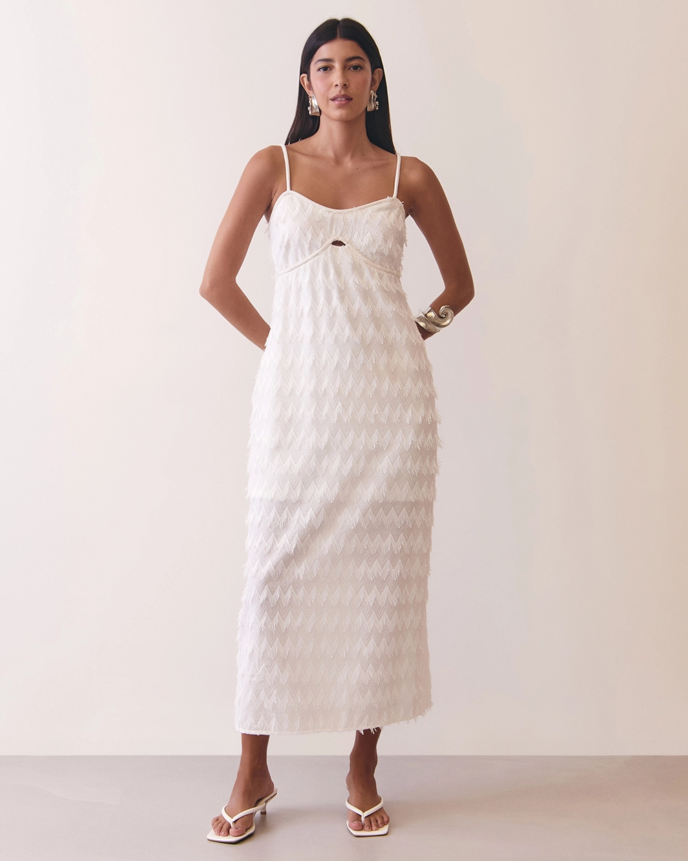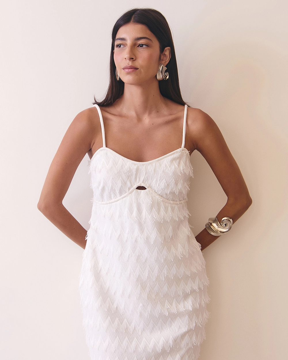 Ficha técnica 🧵: 80% viscose, 20% poliamida. Modelagem reta com comprimento midi, decote reto com recorte abaixo do busto e alças finas. Cor: off-white. Origem: nacional. Cuidados: lavar à mão com sabão neutro, não torcer, secar à sombra e passar em temperatura baixa.