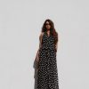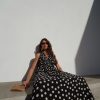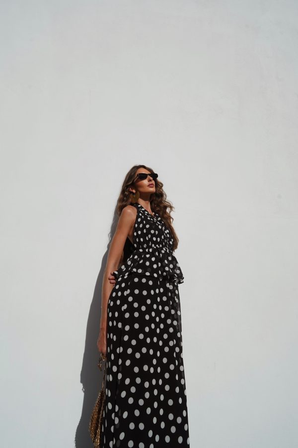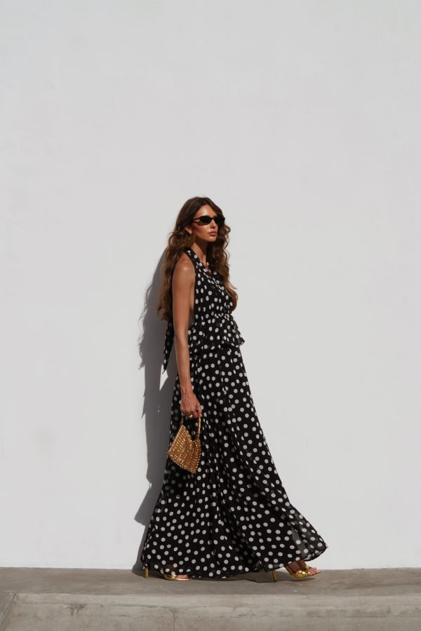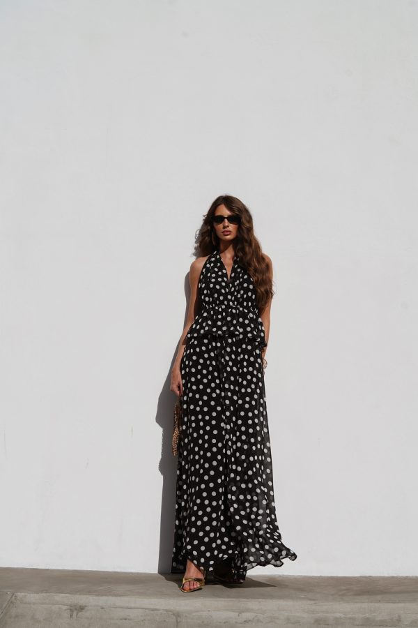 Palavras-chave: vestido longo, vestido preto de poá, vestido sofisticado, vestido fluido, vestido elegante, vestido casual chic.